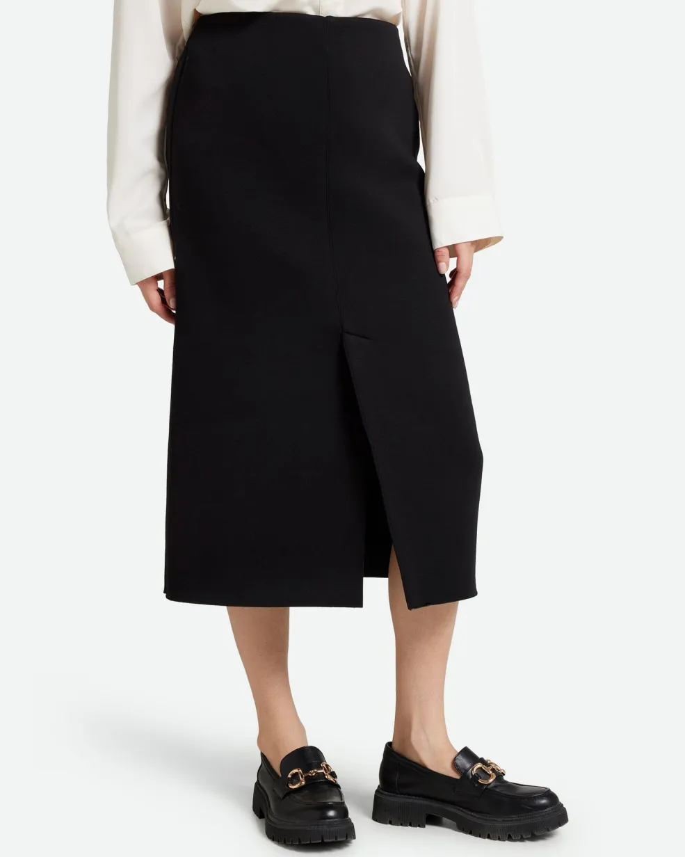 Sort nederdel fra Moves By Minimum i kalvelængde med lige silhuet og frontslid. Den enkle stil passer til både kontoret og festlige lejligheder.