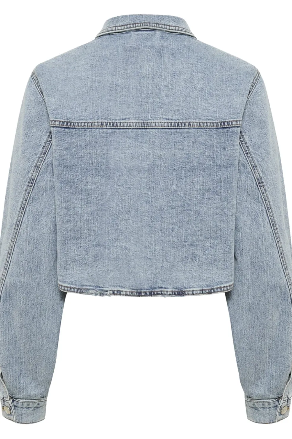 Lys denimjakke fra Gestuz i cropped design med klassisk krave og knaplukning. To brystlommer og dekorative syninger giver jakken et rustikt udtryk.