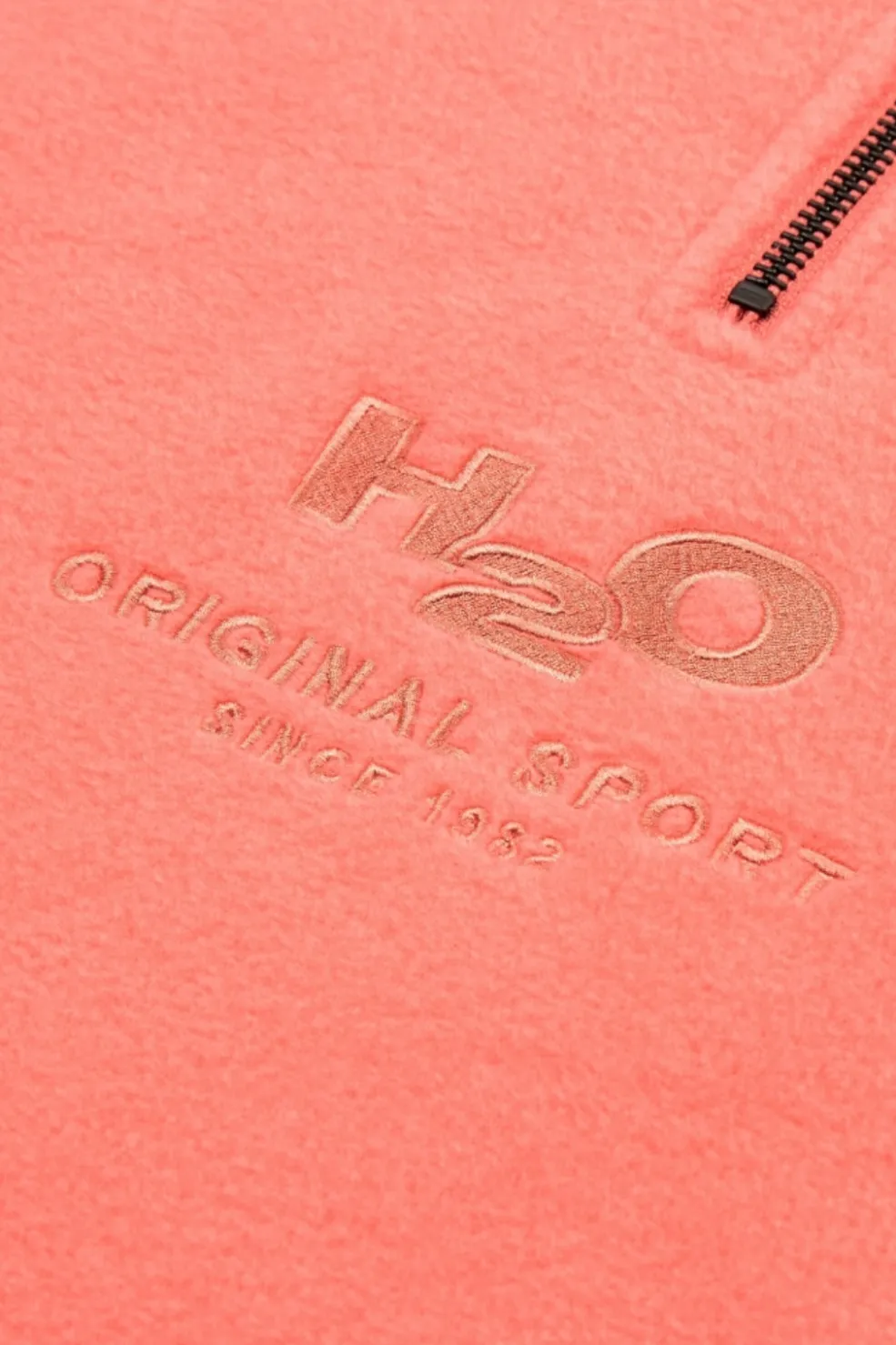 Fleecepullover fra H2O i koralfarve med halv lynlås. Den bløde fleece giver varme og komfort, mens det broderede logo på brystet viser sportsmærkets historie siden 1982.