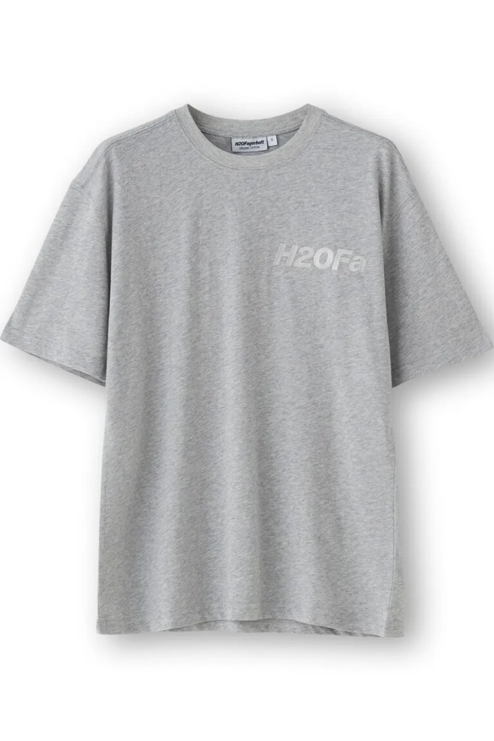 Grå meleret t-shirt fra H2O Fagerholt med oversized pasform. T-shirten har et broderet H2OFa-logo på brystet og en rund halsudskæring.