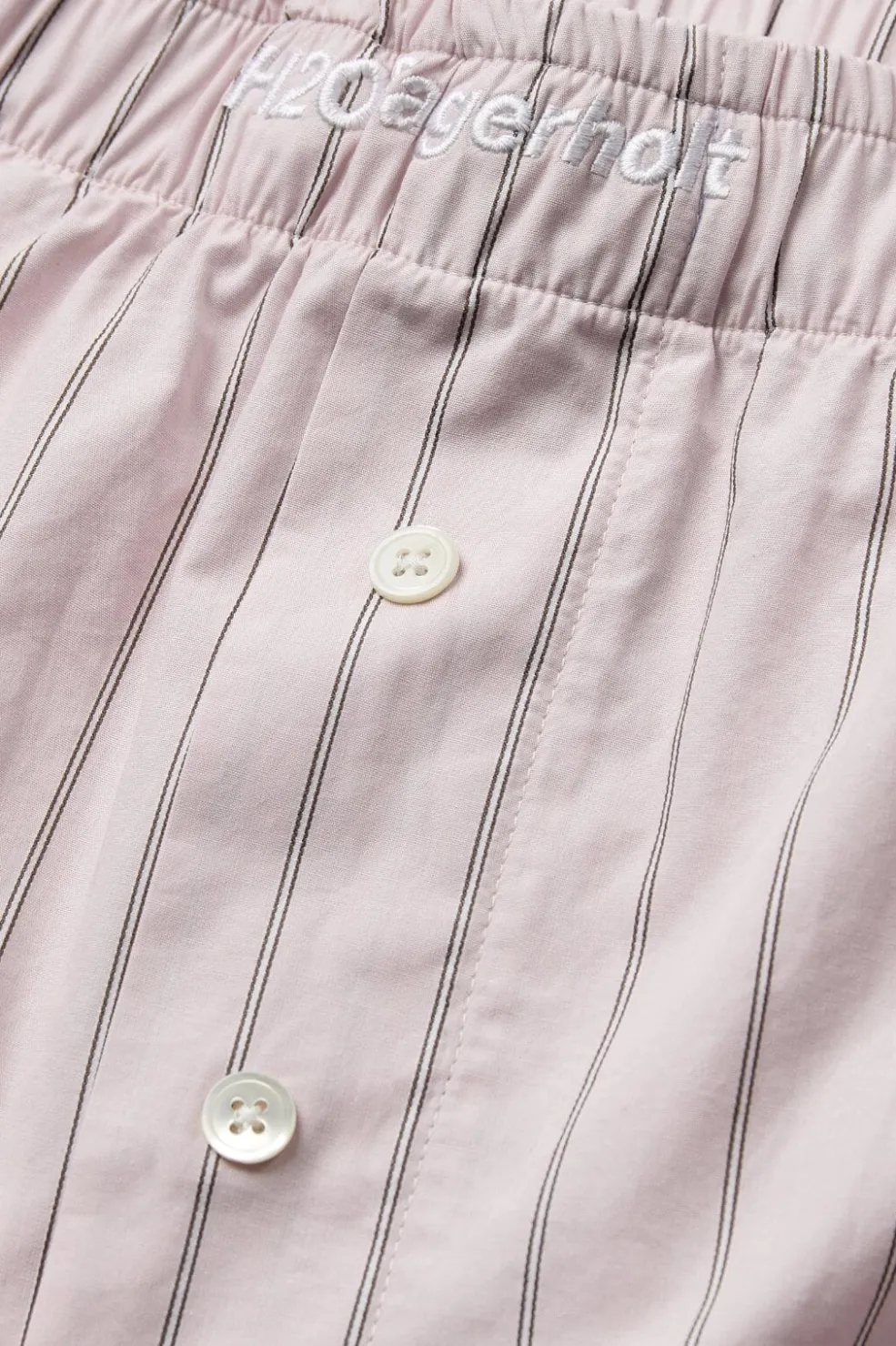 Stribede shorts fra H2O i en lys lyserød nuance. De har vertikale striber og en lårlang længde med elastik og knapper i taljen.