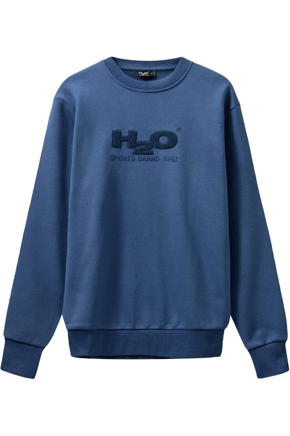 Indigo blå sweatshirt fra H2O med broderet logo på forsiden. Den har en O-halsudskæring og en regular fit, der sidder løst og behageligt på kroppen.