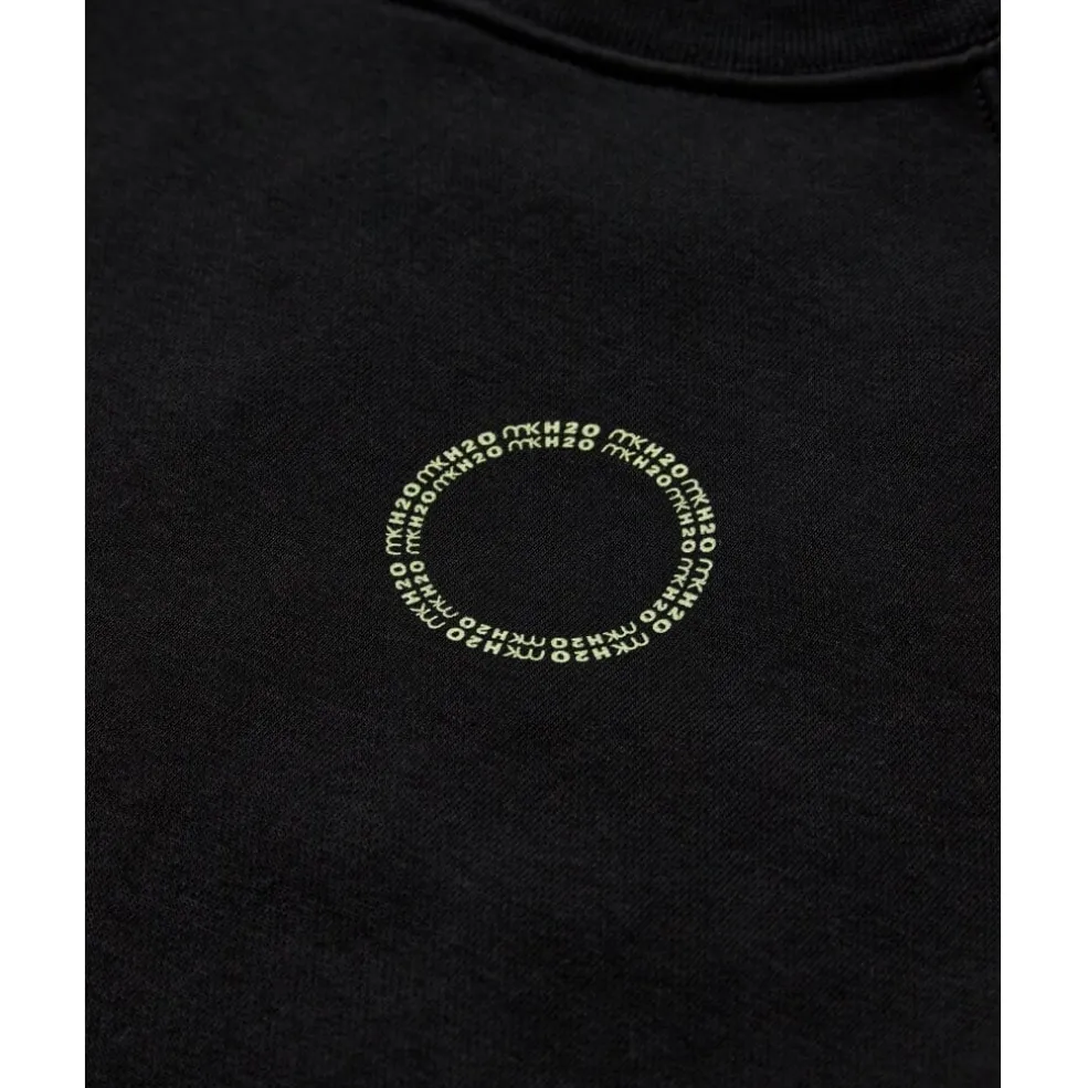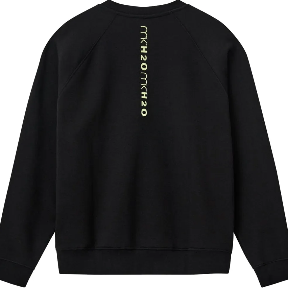 Sort sweatshirt fra H2O med rund halsudskæring. Designet med MKH2O-logo på brystet og lodret tekst på ryggen i en lysere nuance.