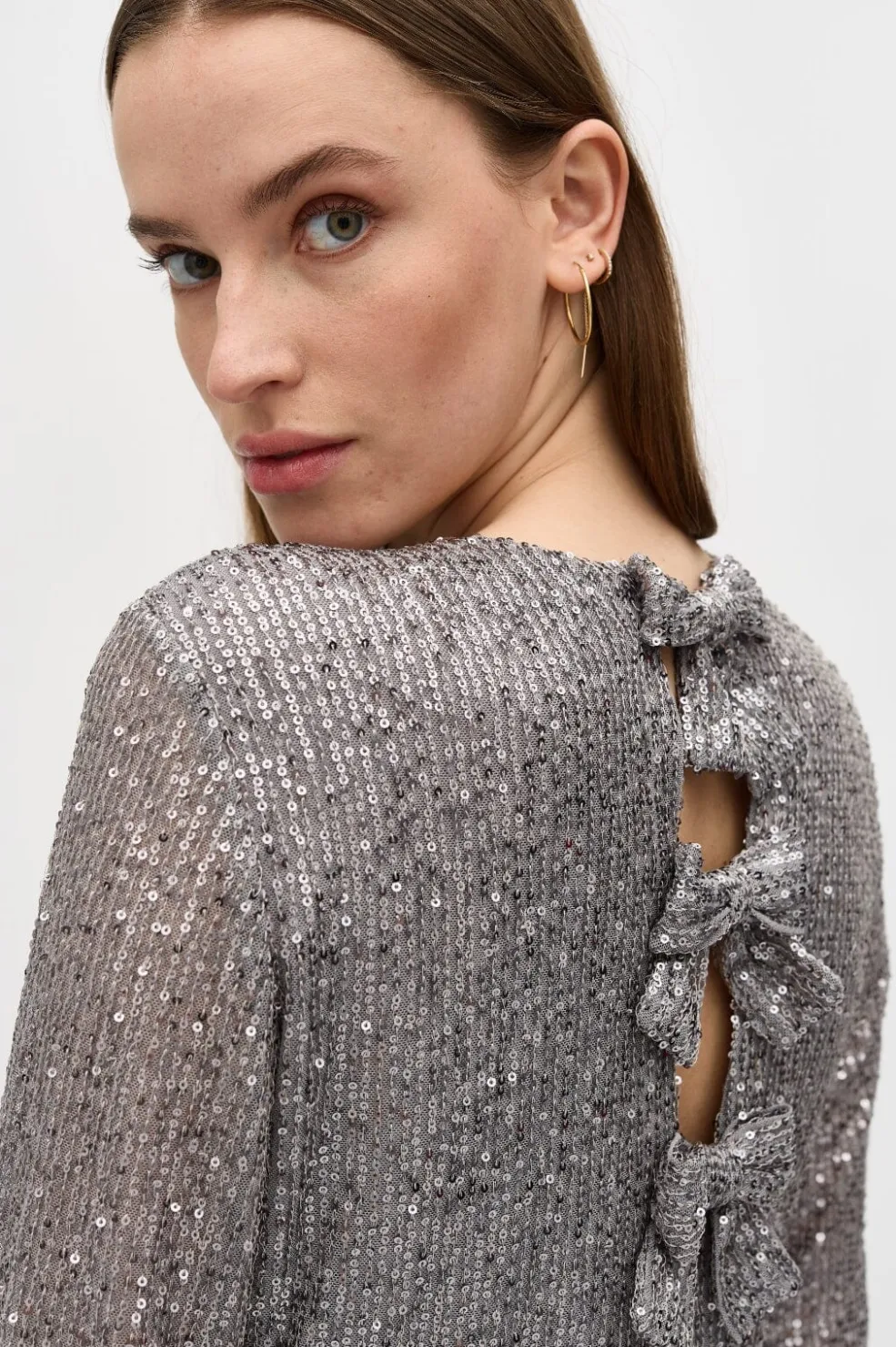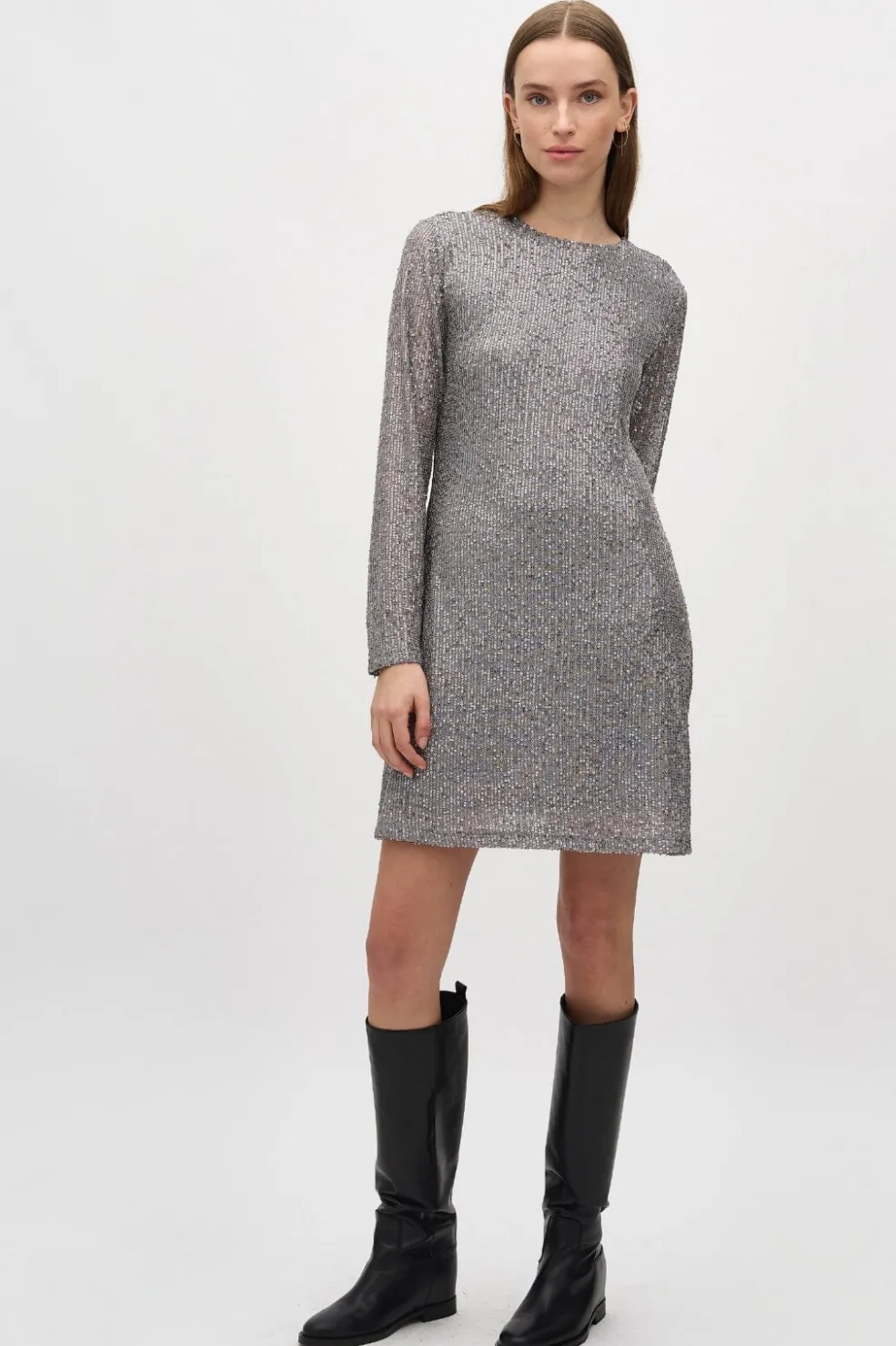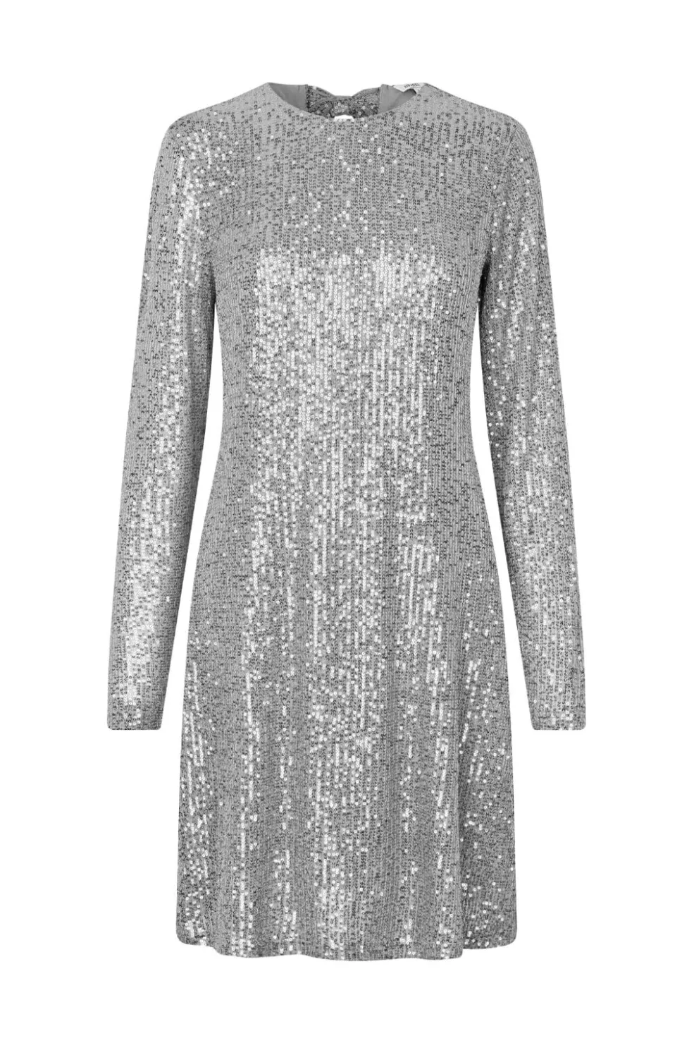 Sølvgrå kjole fra MbyM med pailletter over det hele. Kjolen har rund hals, lange ærmer og en lårlang længde. På ryggen sidder sløjfedetaljer og en nøglehulskæring.