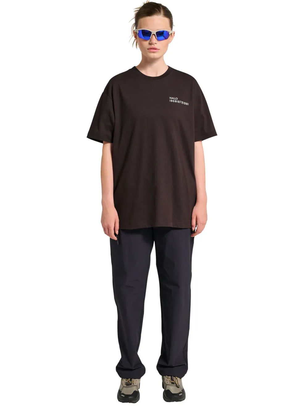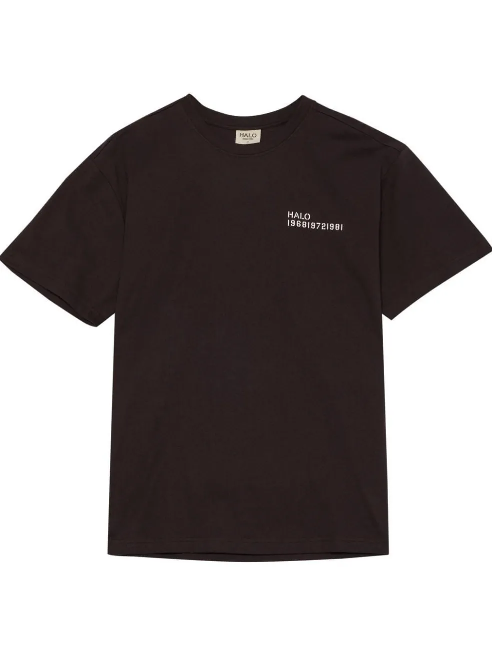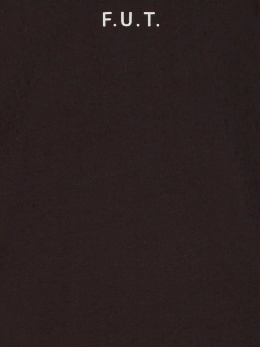 Mørkebrun t-shirt fra HALO, lavet af 100 % økologisk bomuld. T-shirten har korte ærmer og en løs pasform med F. U.T.-tekst på ryggen.