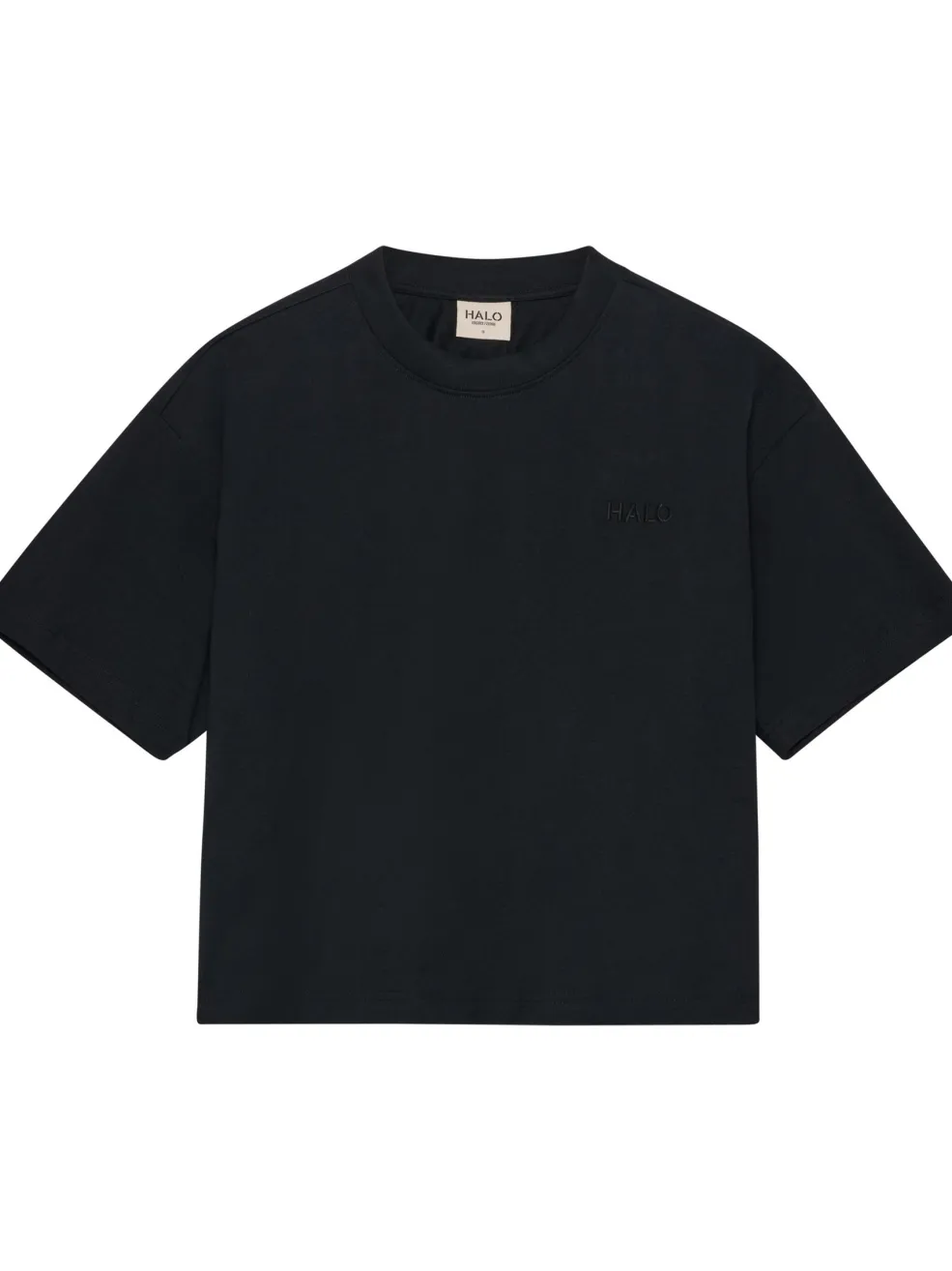 Sort t-shirt fra Halo, lavet af økologisk bomuld. T-shirten har et broderet logo og en løs pasform.