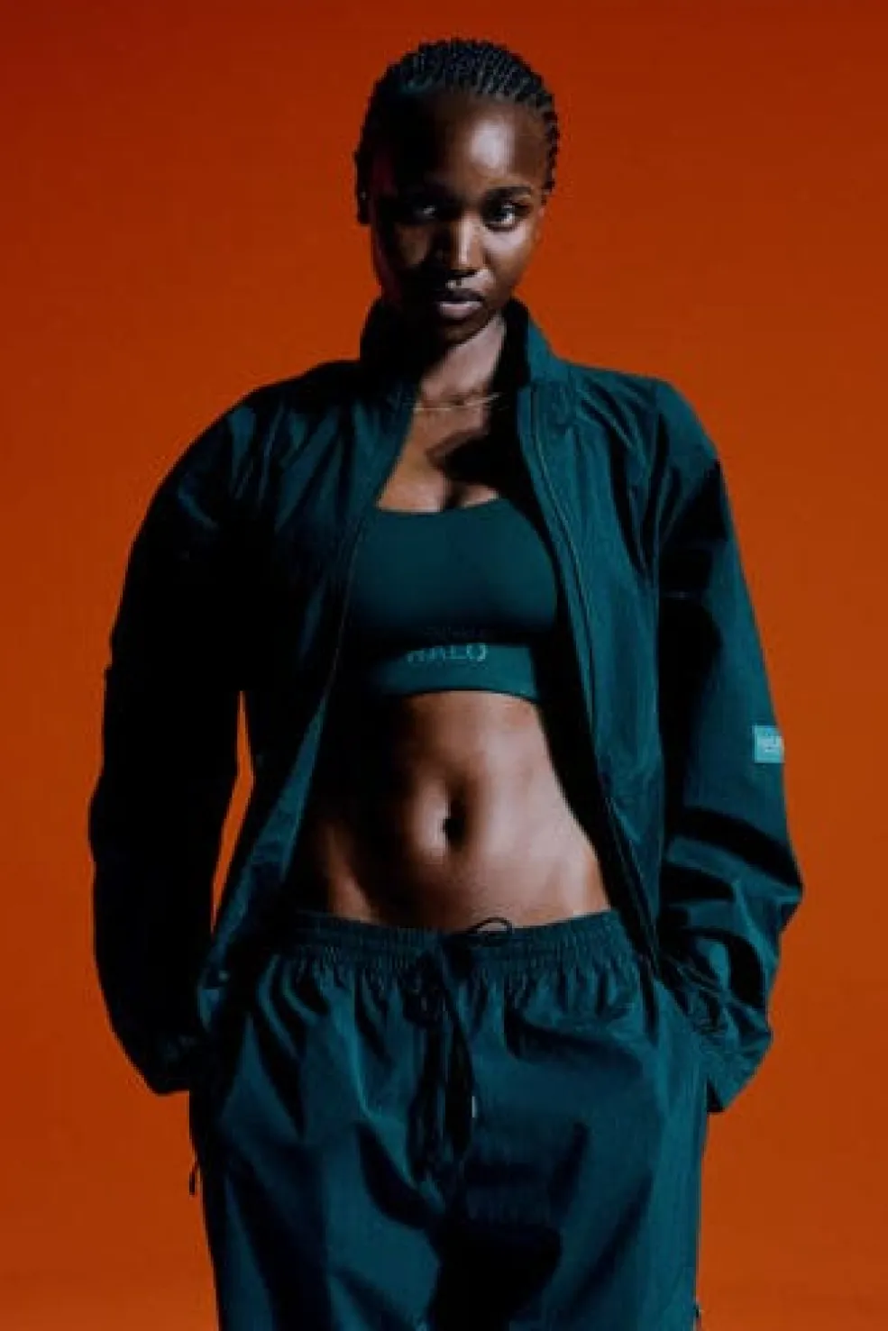 Sort trænings-BH fra Halo med brede skulderstropper og rund halsudskæring. BH’en har refleksprint med HALO- og ATW-logo.