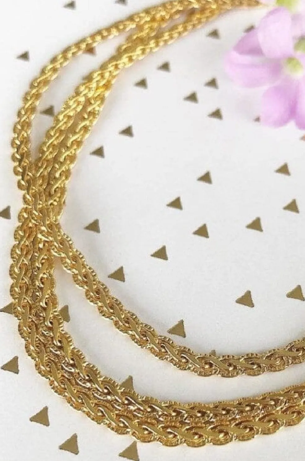 Et forgyldt halskæde fra Friihof+Siig med et flettet design. Kæden har flere sammensatte kæderækker, der skaber et detaljeret mønster.