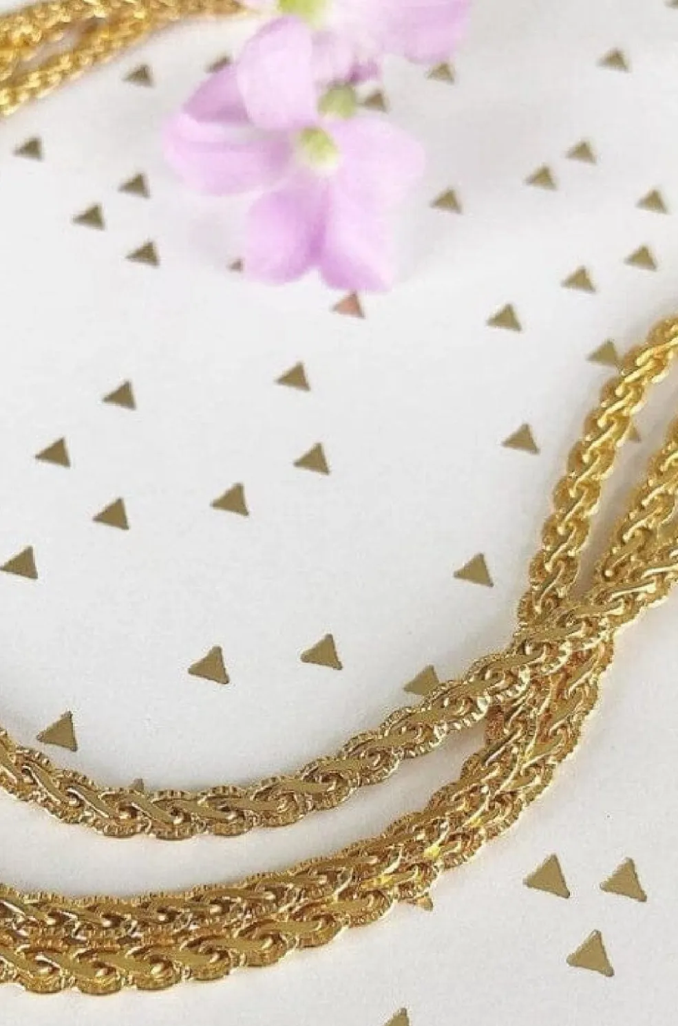 Halskæden kan justeres mellem 41 og 46 cm med den indbyggede forlænger. Luk kæden i nakken, og juster længden efter behov. Den forgyldte overflade kræver skånsom behandling. Undgå kontakt med vand, parfume og andre væsker. Tør kæden af med en blød, tør klud efter brug.