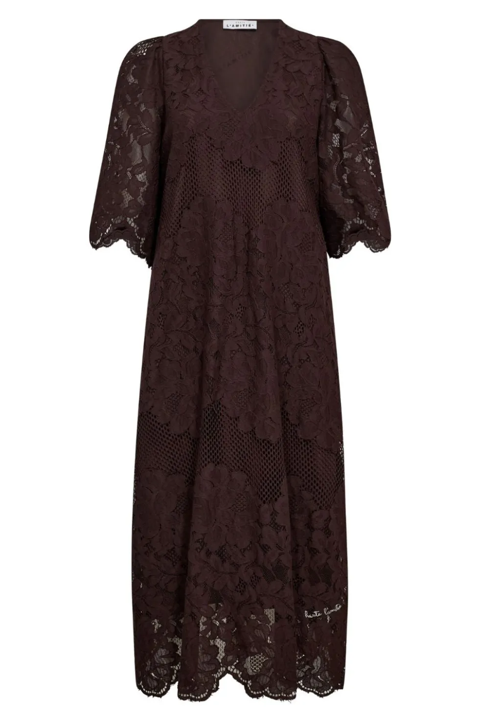 Brun kjole fra Haute L’Amitié med blondemønster i blomsterprint. Kjolen har 3/4-ærmer, V-udskæring og en længde til læggen. Den er lavet i en blanding af polyamid og bomuld.