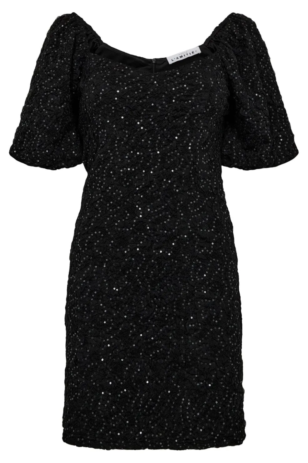 Sort pailletkjole fra Haute L’Amitié. Kjolen har pailletdetaljer over hele overfladen og er designet til fester og formelle lejligheder.