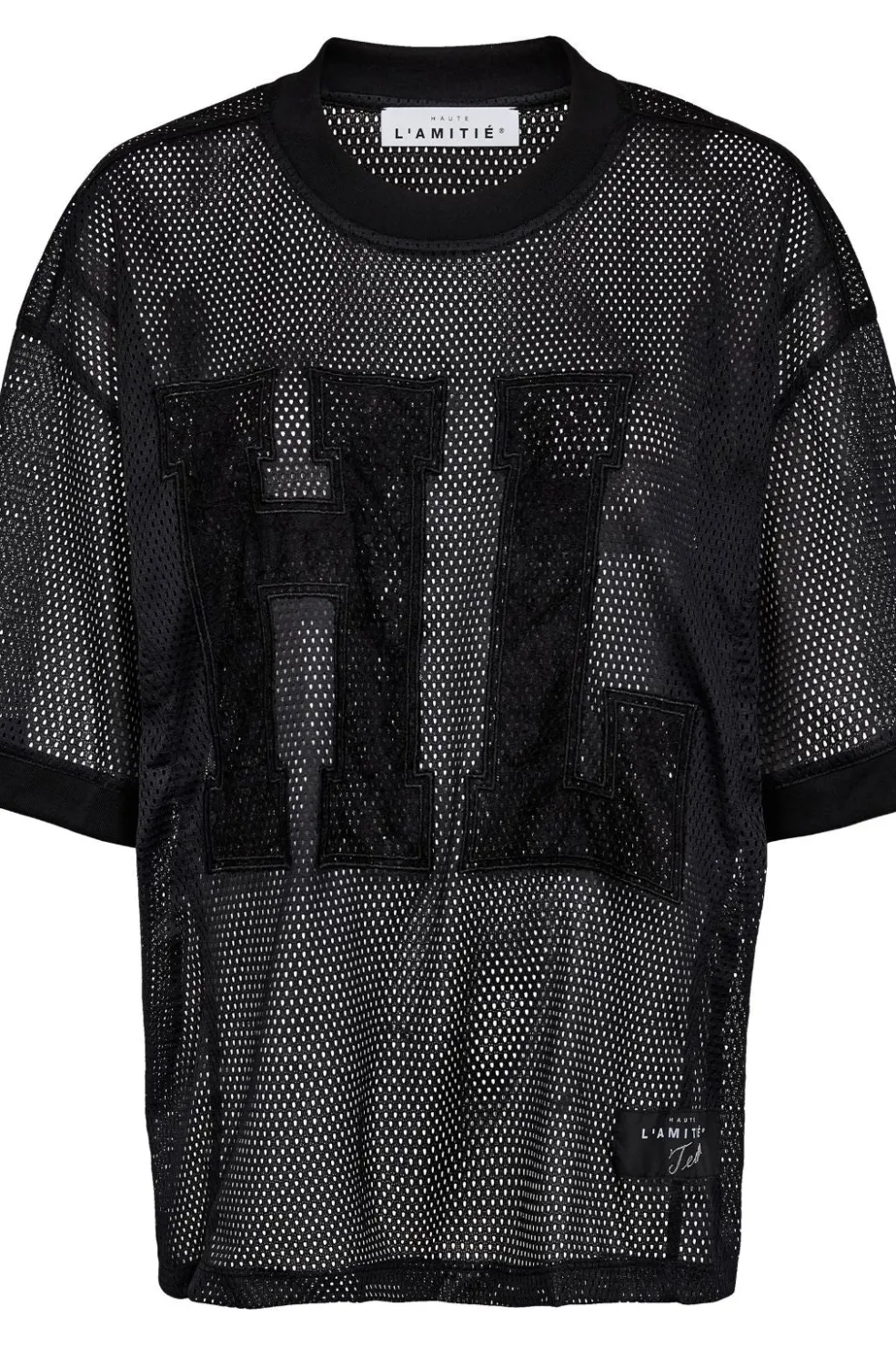 Sort mesh T-shirt fra Haute L’Amitié med gennemsigtigt design. Lavet af 100 % polyester med store HL-bogstaver på forsiden og dekorative syninger.