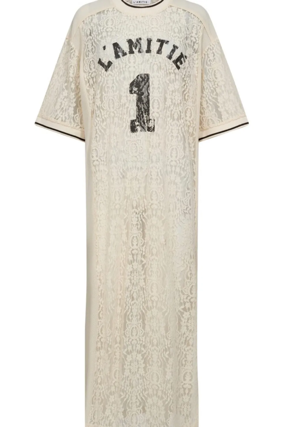 Blondekjole fra Haute L’Amitié i perlefarvet nuance med fodboldinspireret print. Kjolen har blonder og pailletter, der giver den et feminint udtryk.