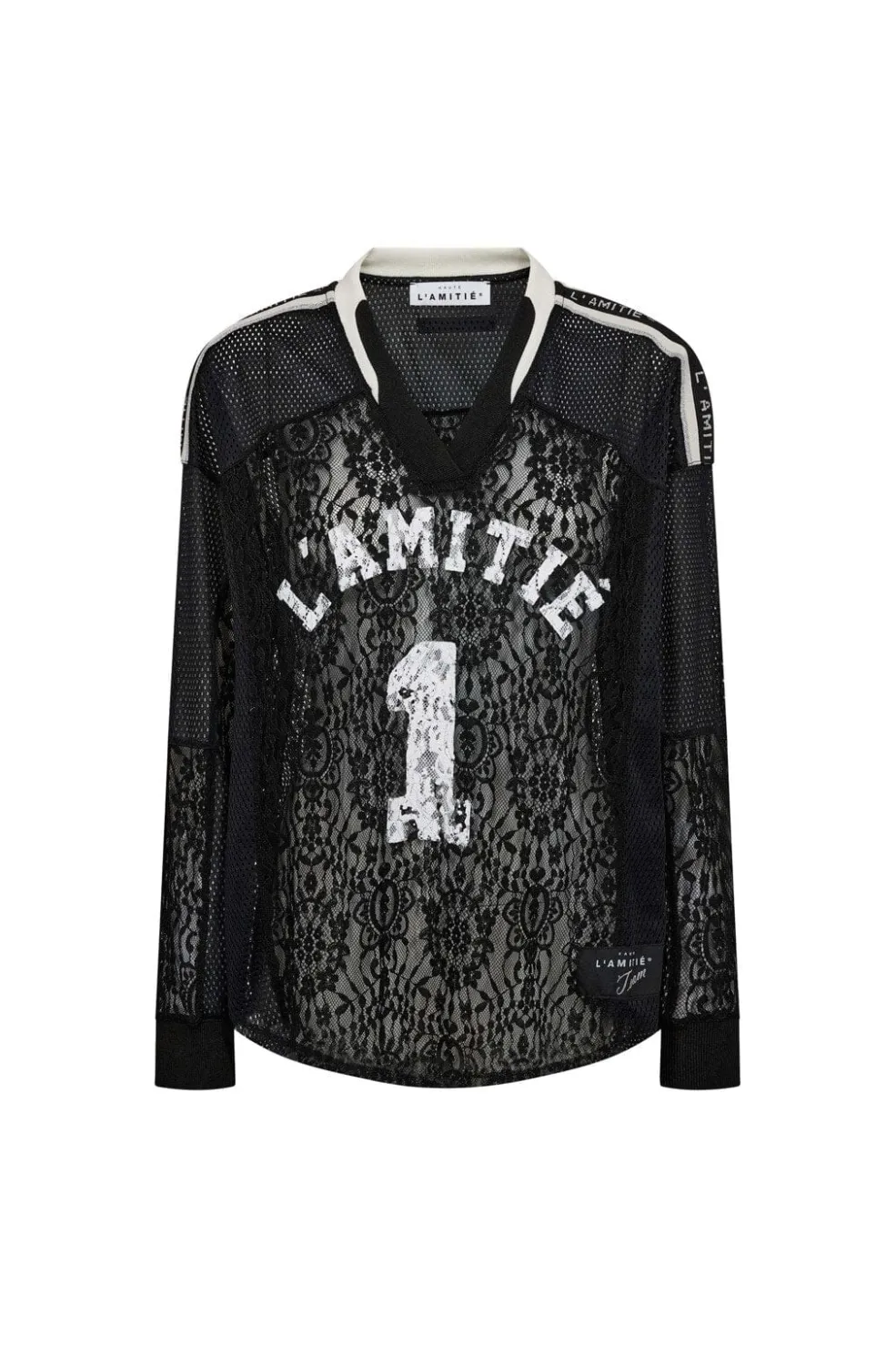 Sort bluse fra Haute L’Amitié med blondemønster og pailletter. Blusen har en V-hals og en løs pasform med lange ærmer.
