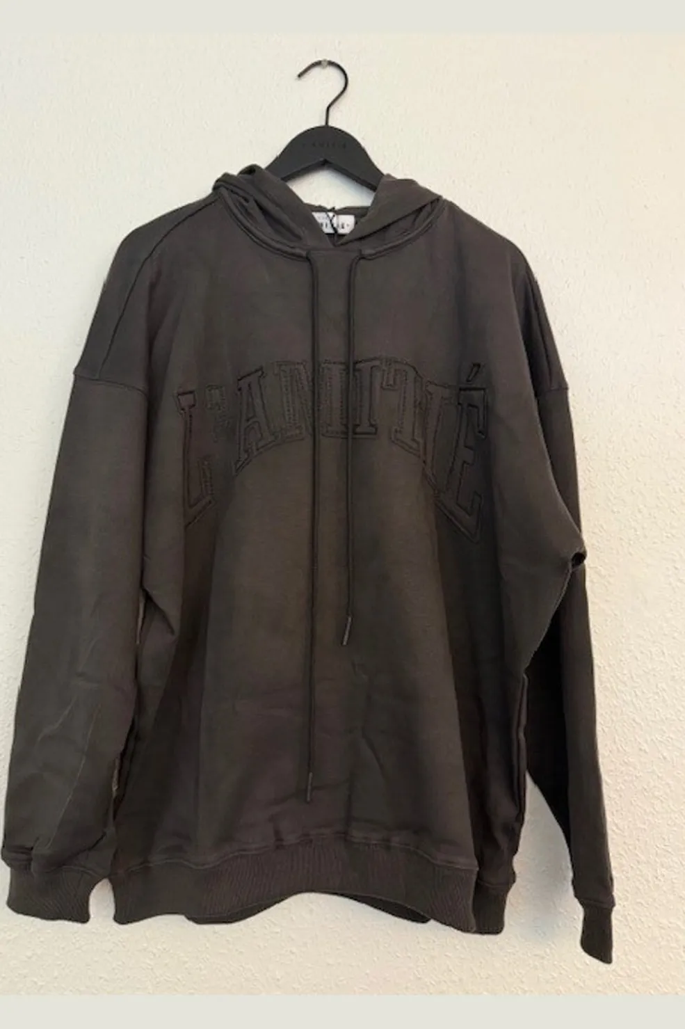 Mørkegrå hoodie fra Haute L’Amitié med teksten L’Amitié på forsiden. Hoodien har en afslappet pasform og dekorative syninger.