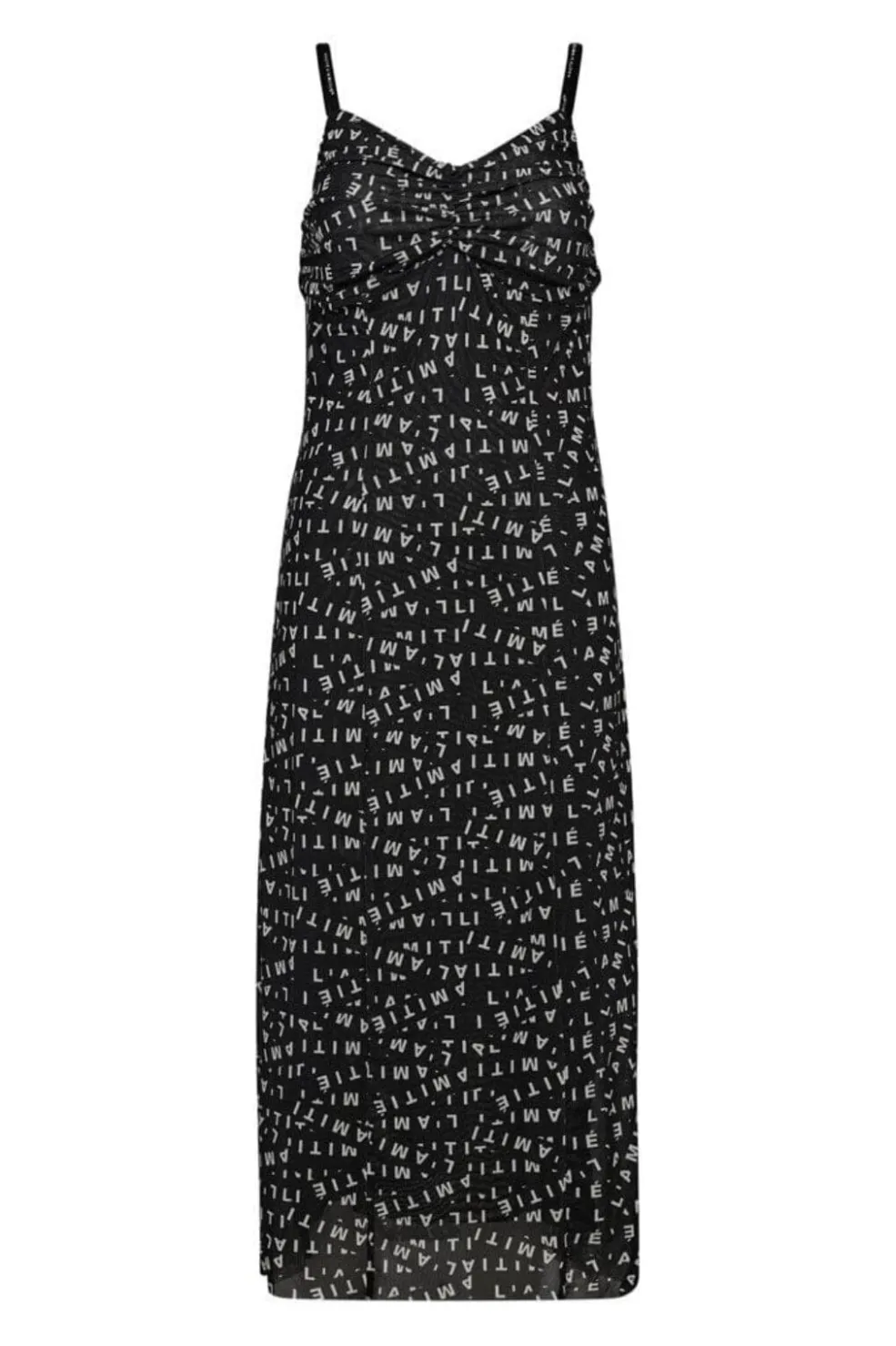 Sort kjole fra Haute L’Amitié med hvidt bogstavprint. Kjolen har meshstropper med flæsedetaljer ved brystet og en firkantet halsudskæring.