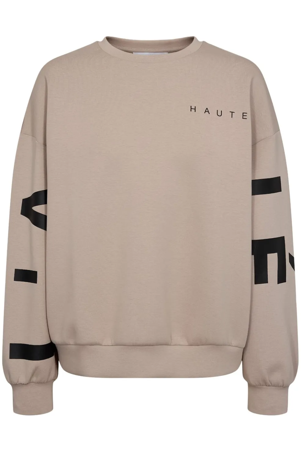 Beige sweatshirt fra Haute L’Amitié med stort sort tryk på bagsiden og ærmerne. Forsiden har mindre tekst.