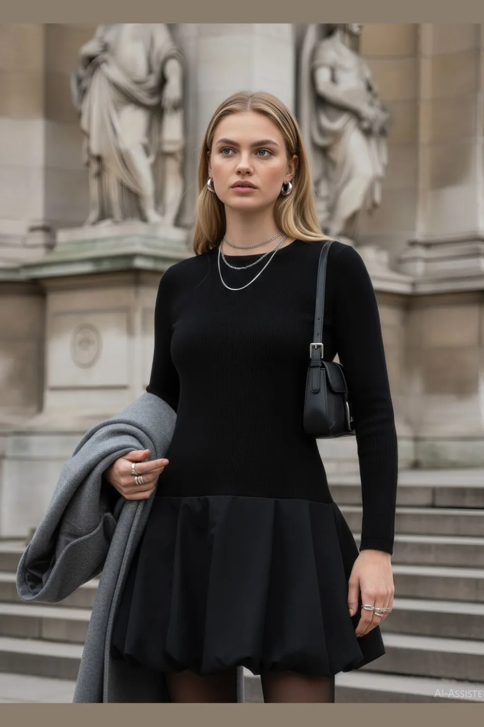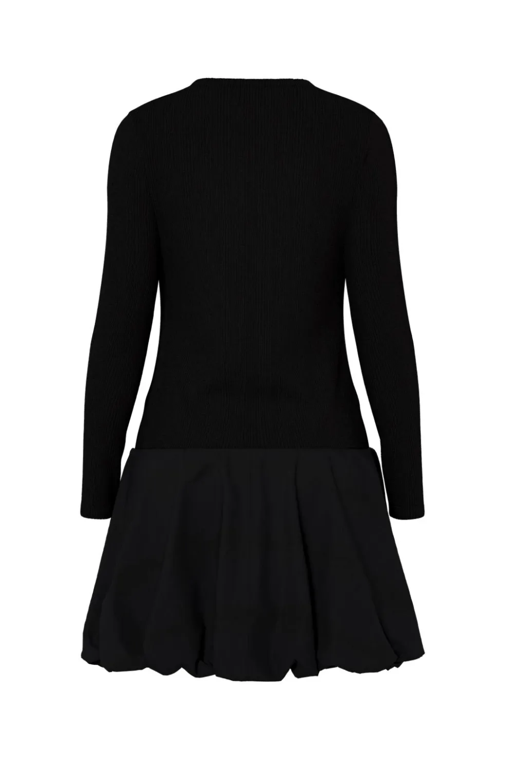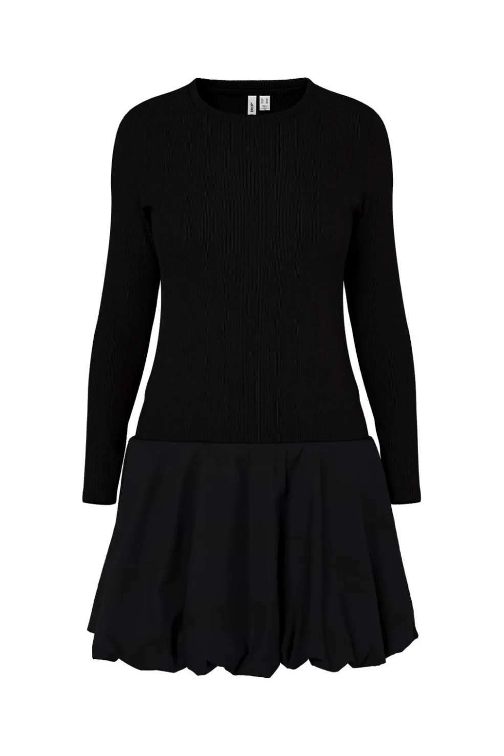 Sort drop waist-kjole fra Hypedrop med lange ærmer og rund halsudskæring. Kjolen har en slim fit-pasform og en voluminøs nederdel med rynker.