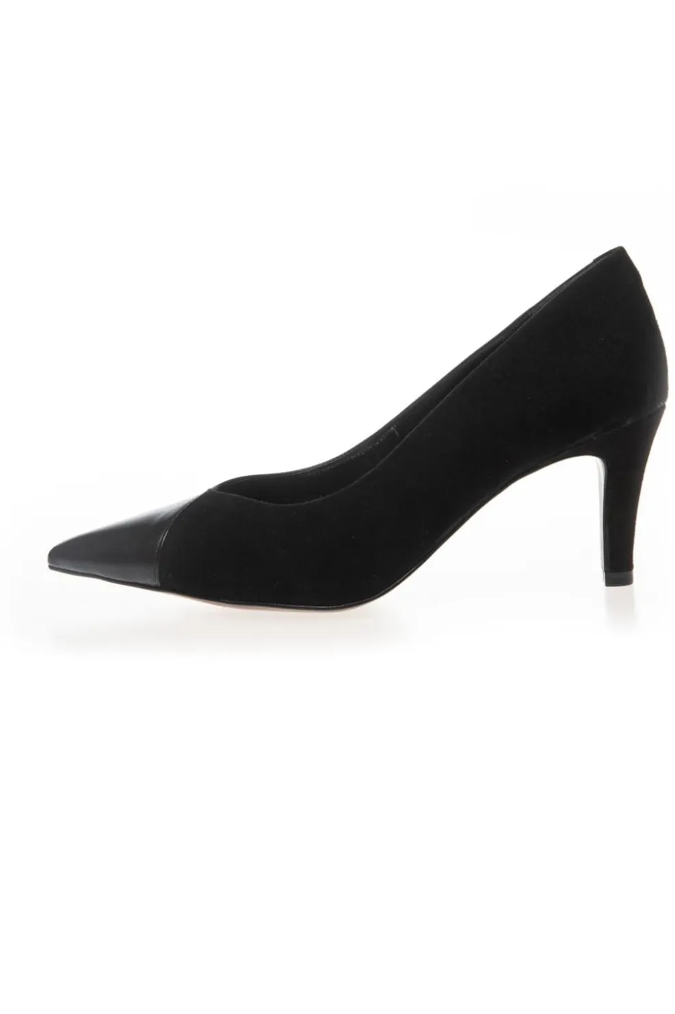 Sorte stiletter fra Copenhagen Shoes med spids tå og stilethæl. Skoen er fremstillet i en kombination af læder på indersiden og ruskind på ydersiden.