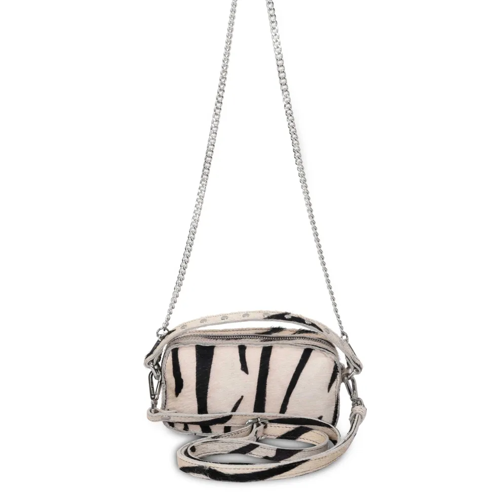 Håndtaske fra Núnoo med zebrastriber i creme og hvid. Tasken har to praktiske forlommer og et stort hovedrum med lynlåslukning.