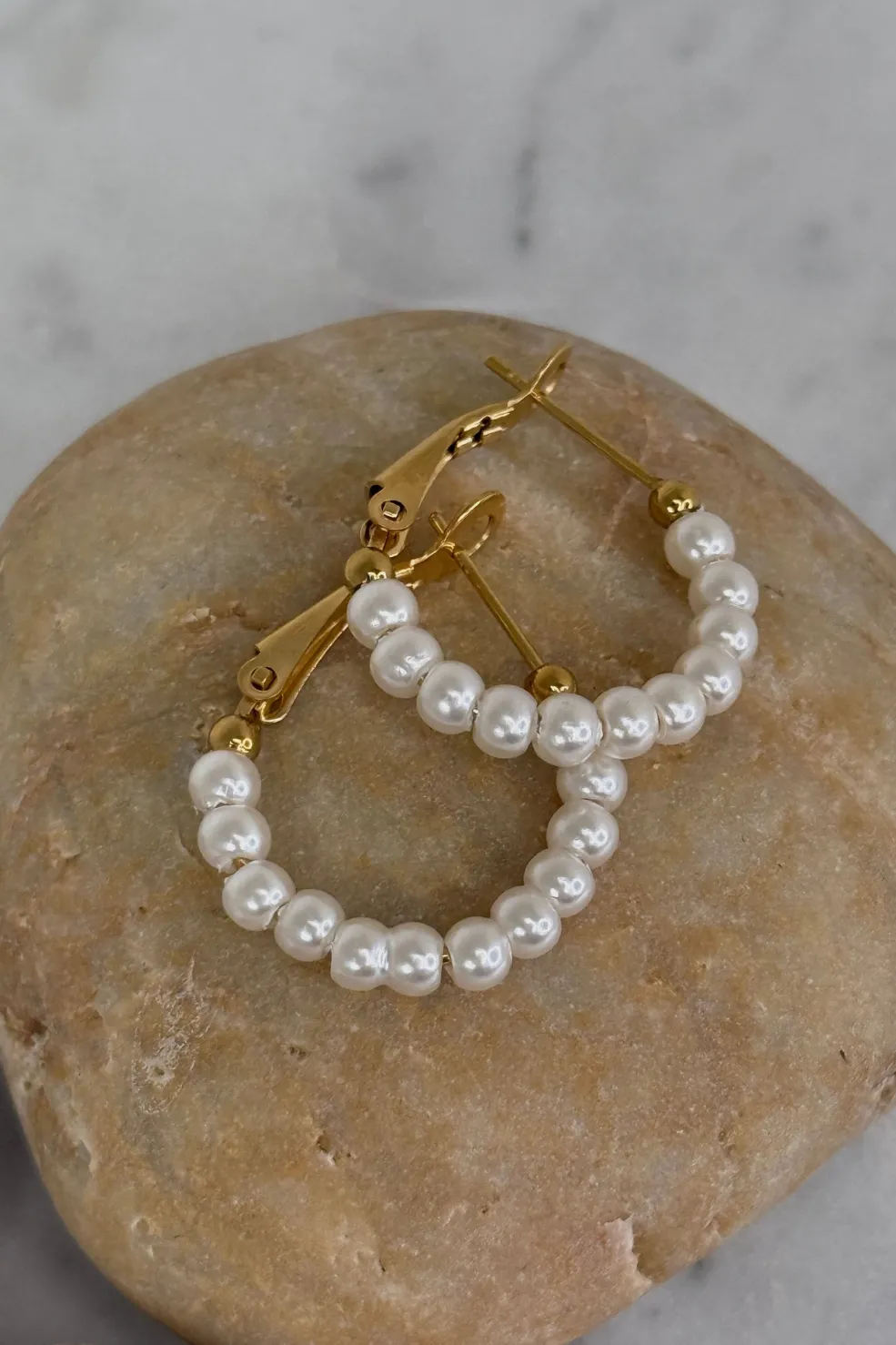 Forgyldte hoops fra Mellow Moon med hvide perler. Øreringene har en rund form, hvor perlerne er sat på den nederste del af hoopet i en fin bue.