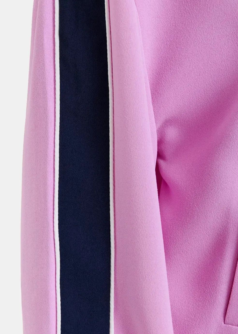 Sportsjakke fra Essentiel Antwerp i pink lavendel med høj krave og lynlås. Jakken har marineblå striber langs ærmerne og bindebåndsdetaljer, der giver et sporty udtryk.