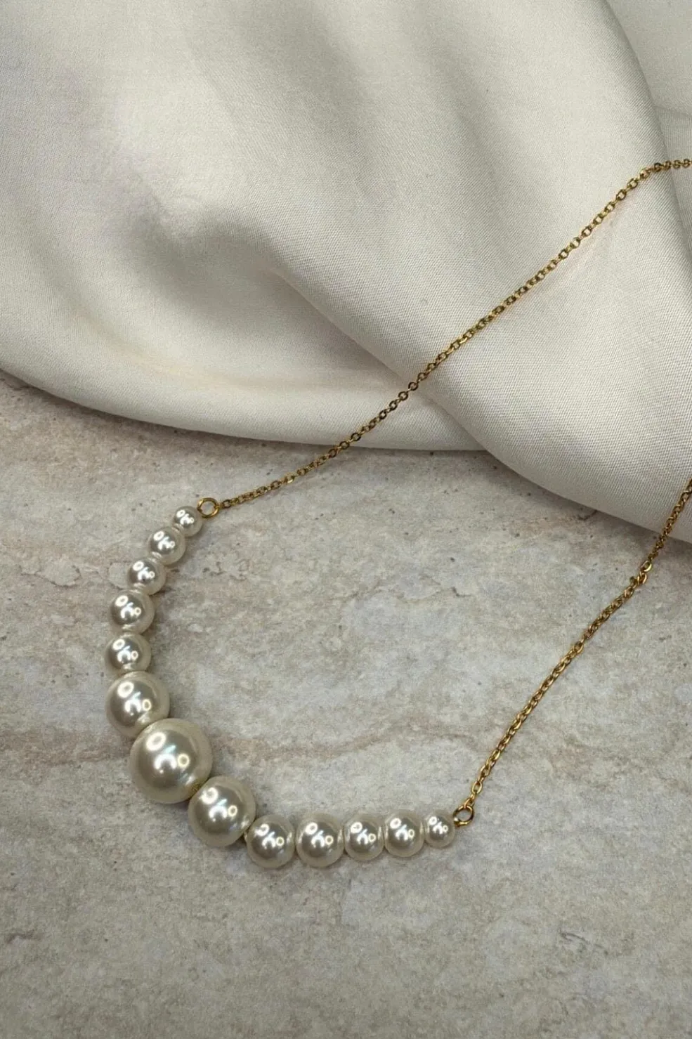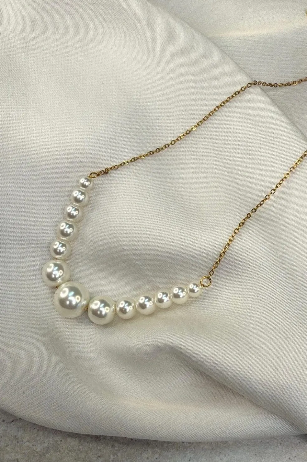 Halskæde fra Molly&My Jewellery med graduerede imiterede perler på en tynd, gylden kæde. Perlerne varierer i størrelse fra små til store.
