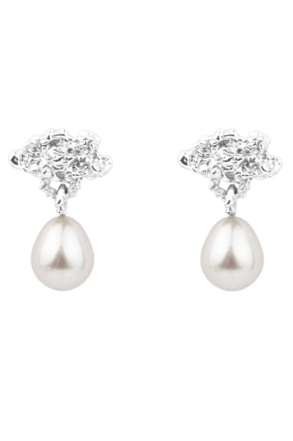 Sølvøreringe fra House Of Vincent med skyformet top og dråbeformet perle. Den teksturerede overflade på toppen giver øreringene et kunstnerisk udtryk.