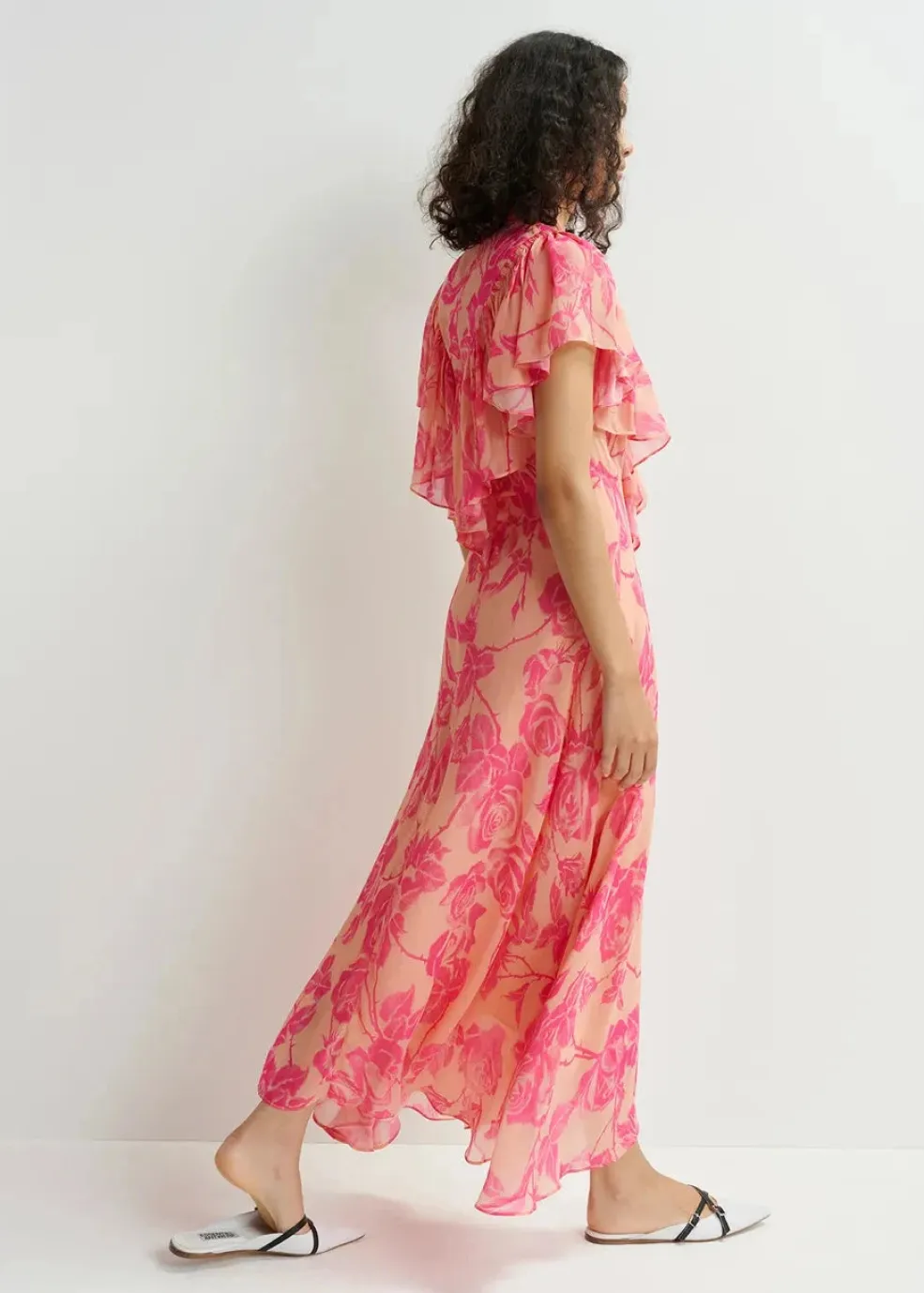 Lang kjole fra Essentiel Antwerp med pink blomstermønster på lys beige baggrund. Kjolen har høj hals, korte ærmer og rynkede detaljer, der skaber bevægelse i stoffet.