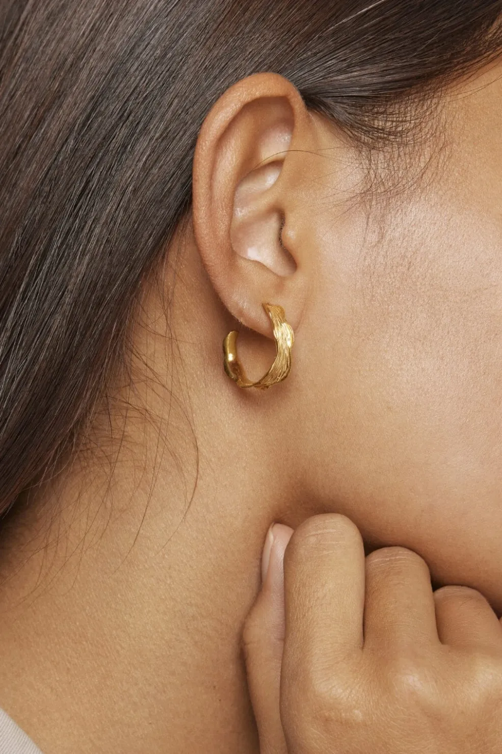 Håndlavede hoops-øreringe fra Enamel Copenhagen med en bølget form. De har en struktureret overflade og er fremstillet i genanvendt sterling sølv med guldbelægning.