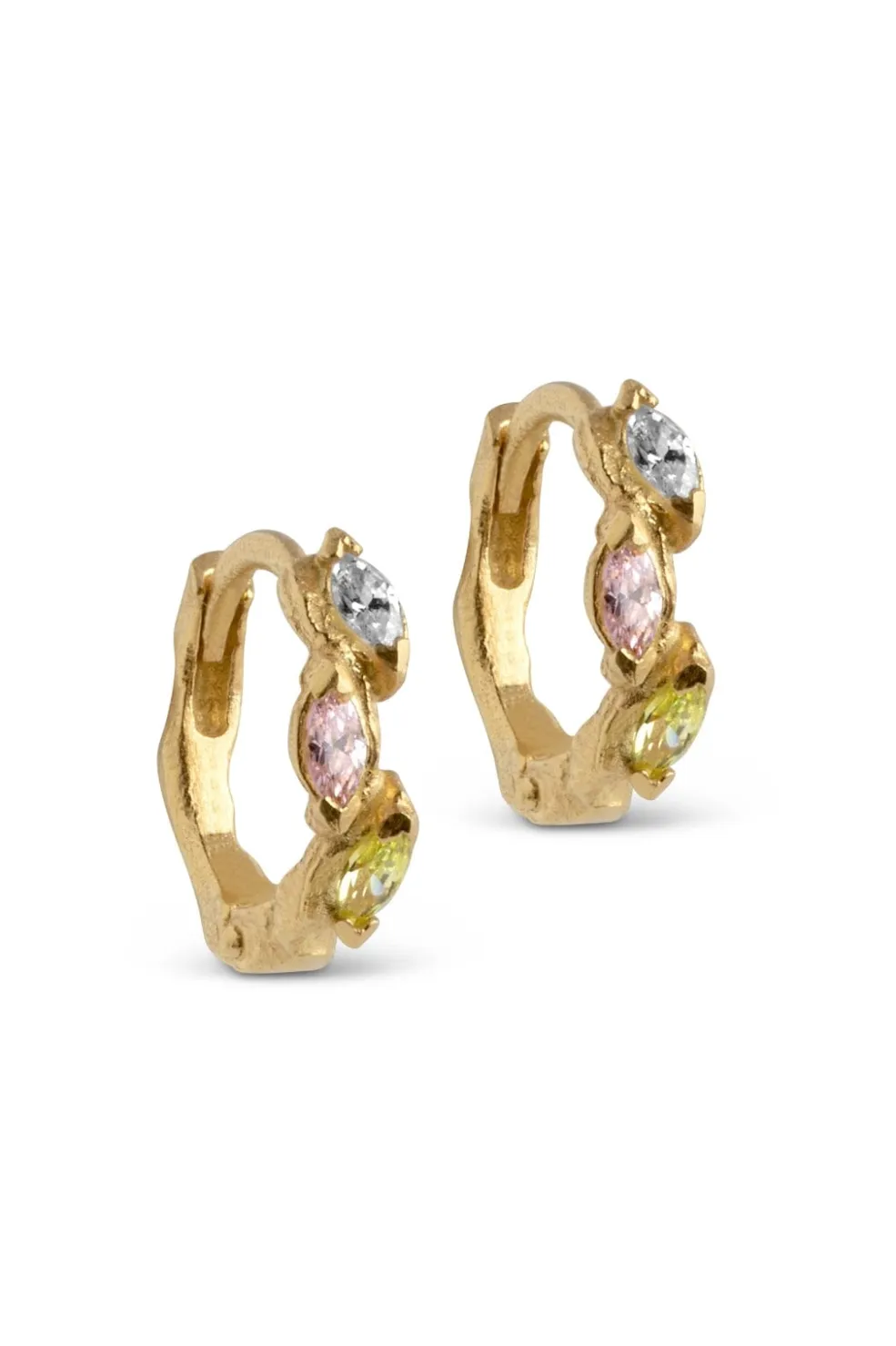 Gyldne hoops fra Enamel Copenhagen med tre marquise-slebne sten. Øreringene har en struktureret overflade og sten i klar, lys pink og lys æblegrøn.