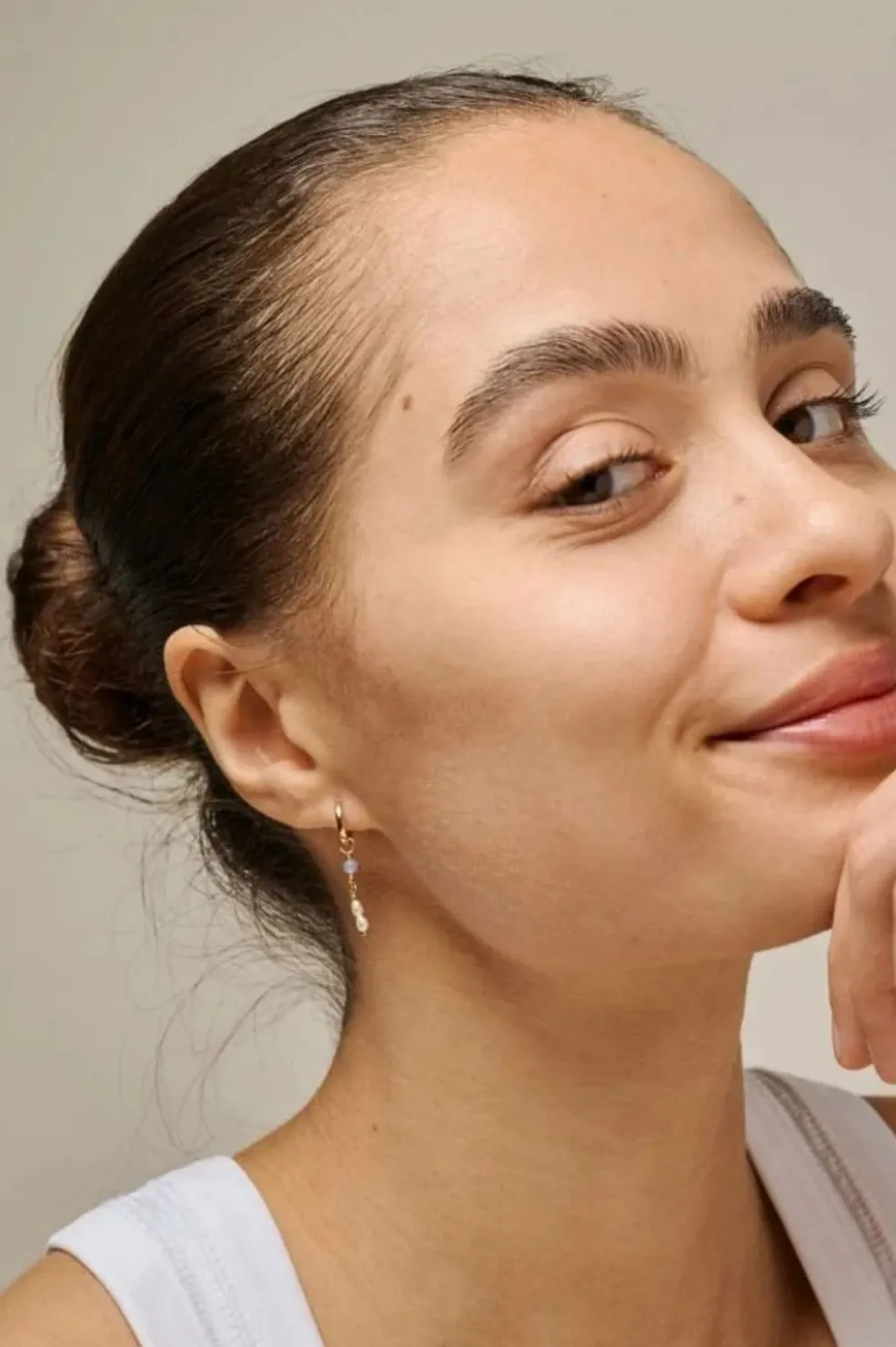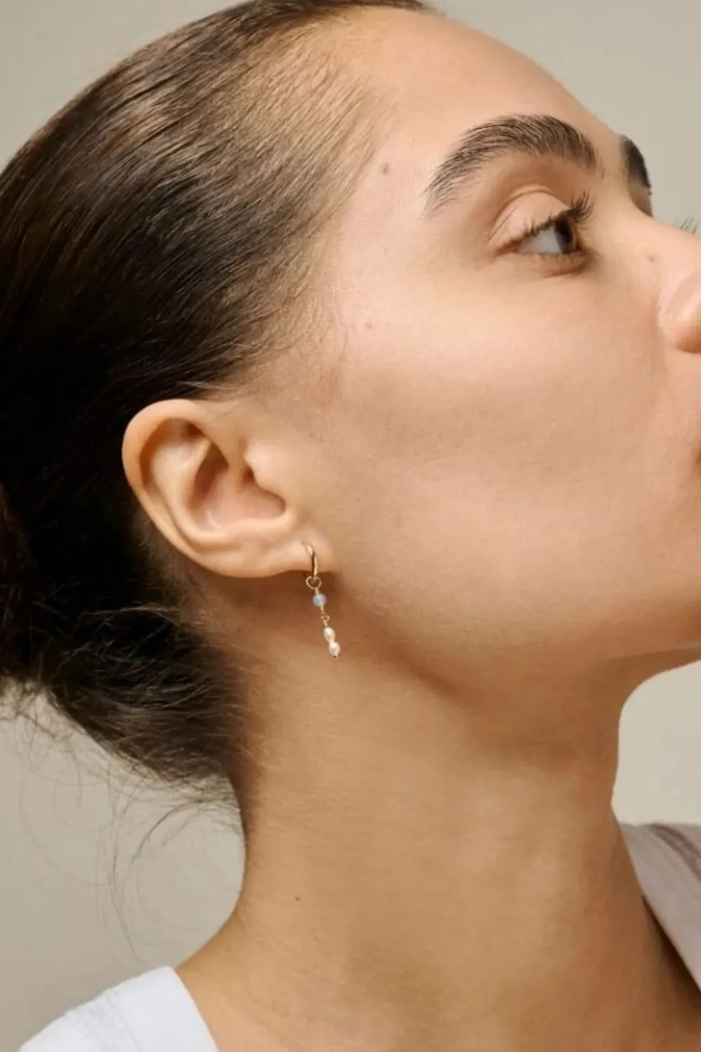 Hoops fra Enamel Copenhagen med blå kvarts og hvide perler. Øreringene har en guldfarvet ring med en blå kvartsperle og to hvide perler som vedhæng.
