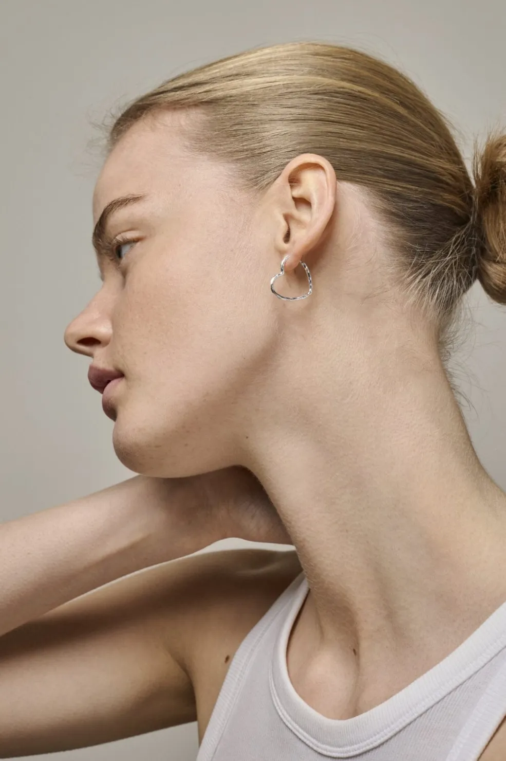 Hjerteformede øreringe fra Enamel Copenhagen med en særlig struktureret overflade. De håndlavede øreringe er synlige fra siden og har en tydelig hjertesilhuet.