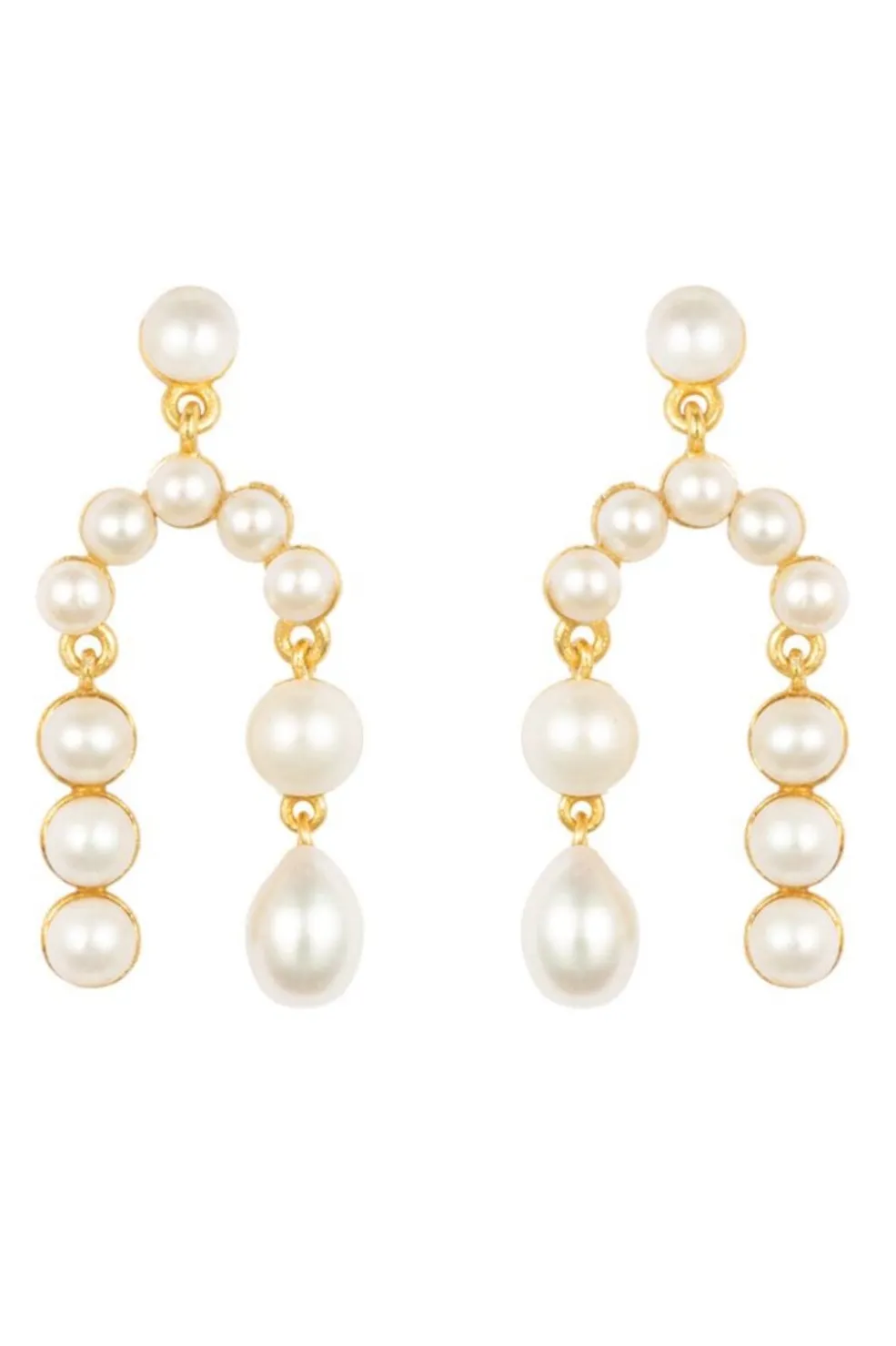 Forgyldte øreringe fra House of Vincent med hvide perler. Smykkerne har en buet form med runde og dråbeformede perler, der er sat i en gylden indfatning.