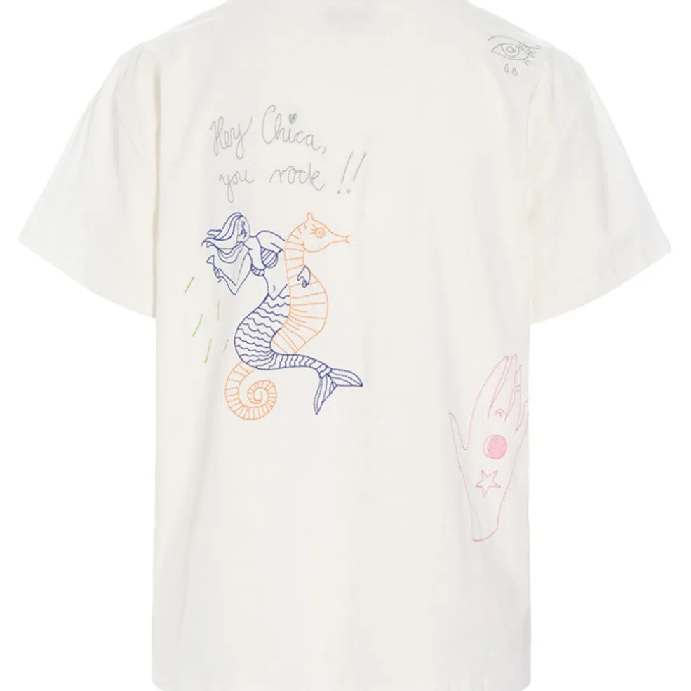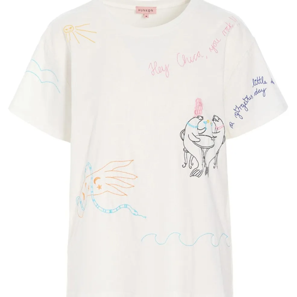 Hvid T-shirt fra Hunkøn med farverige broderier af figurer, symboler og tekst spredt over stoffet.