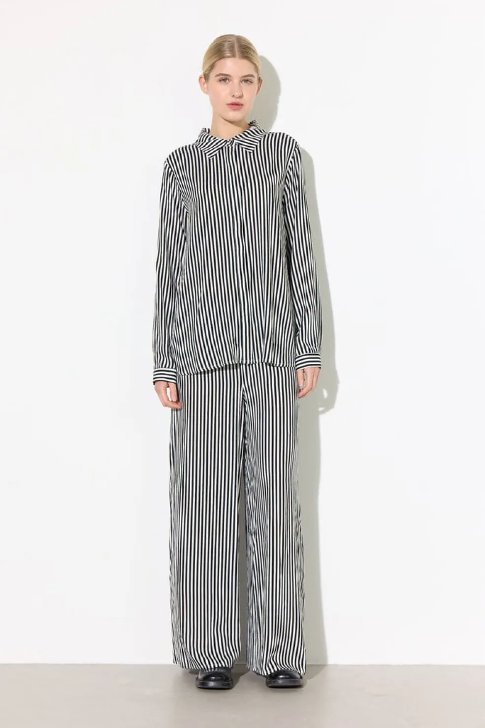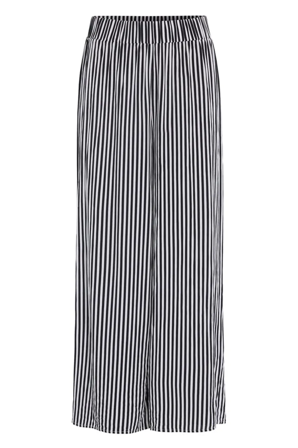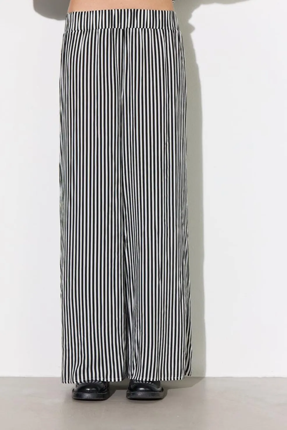 Stribede bukser fra Hunkøn, lavet af 100 % viskose. Bukserne har sorte og hvide vertikale striber og en løs pasform.