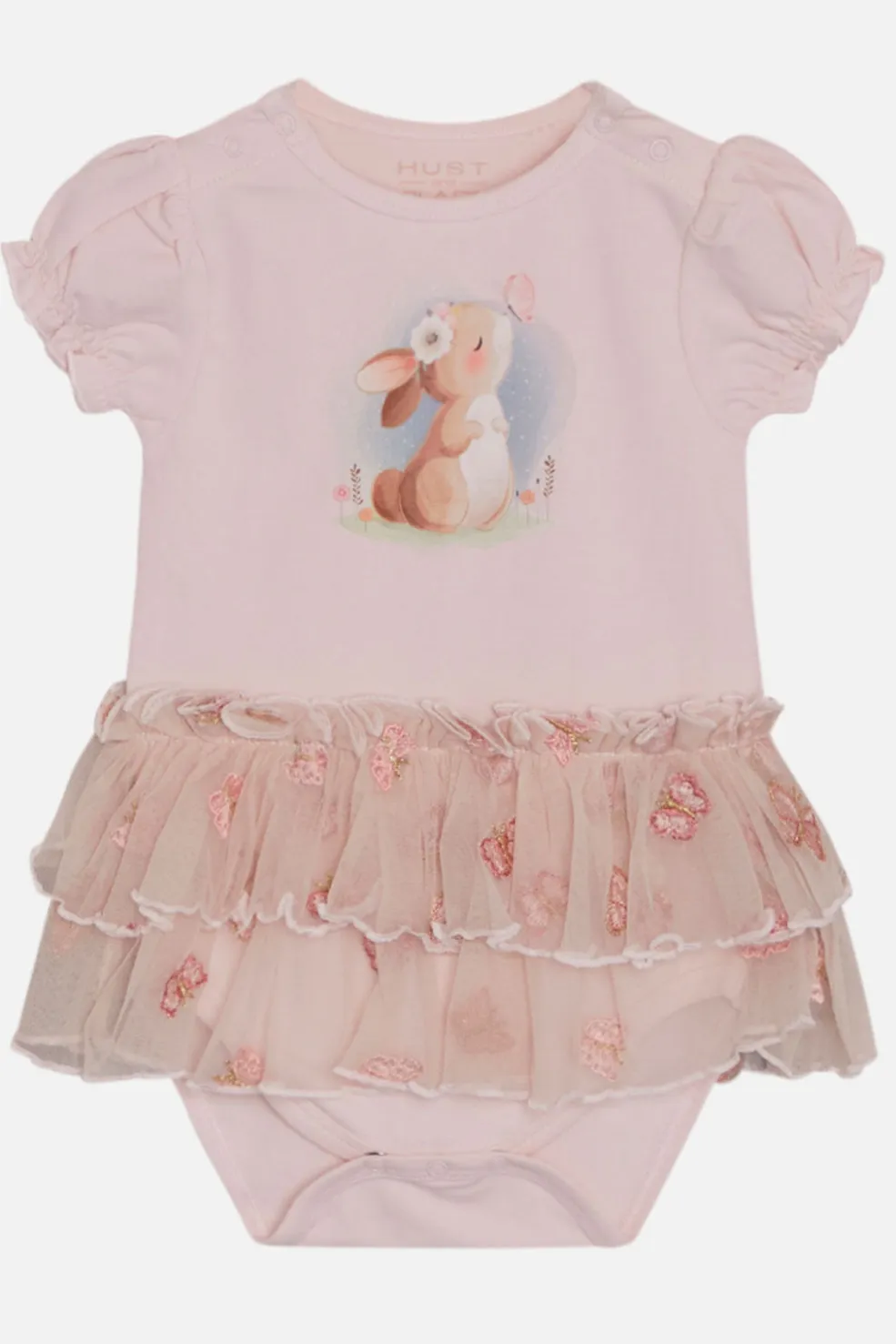 Super sød Kortærmet bodystocking med front print af en kanin på brystet og med påsyet tylskørt med søde broderet sommerfugle. Boosyen har rynk ved skuldrene og elastik i ærmerne. Knappes på skuldrene og mellem benene.