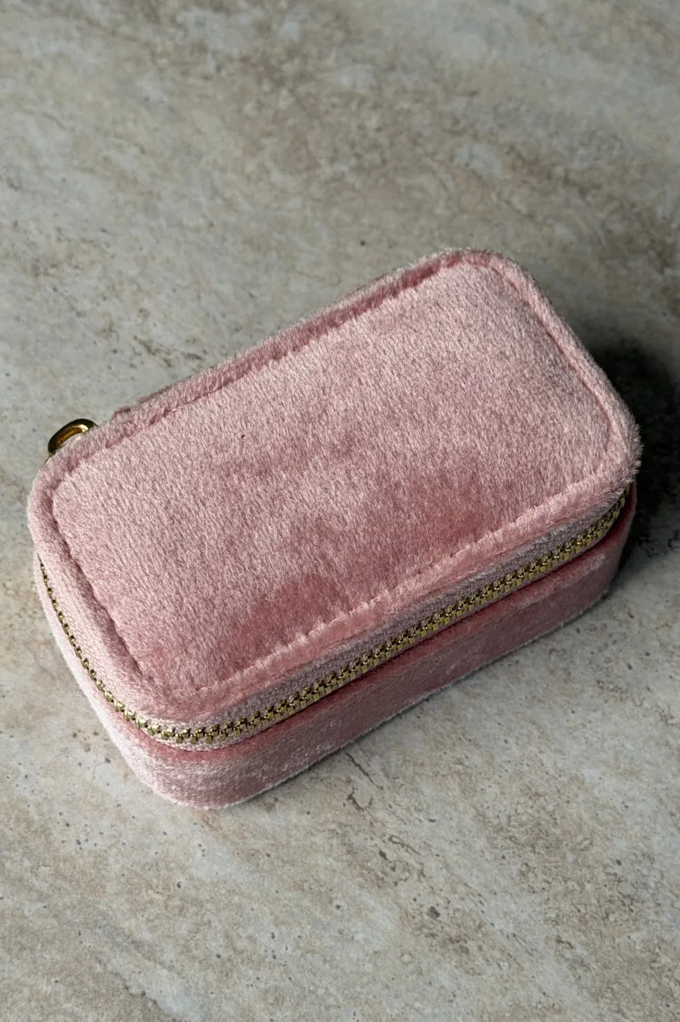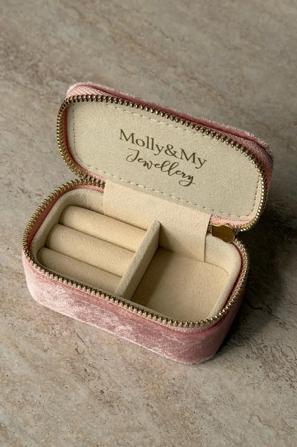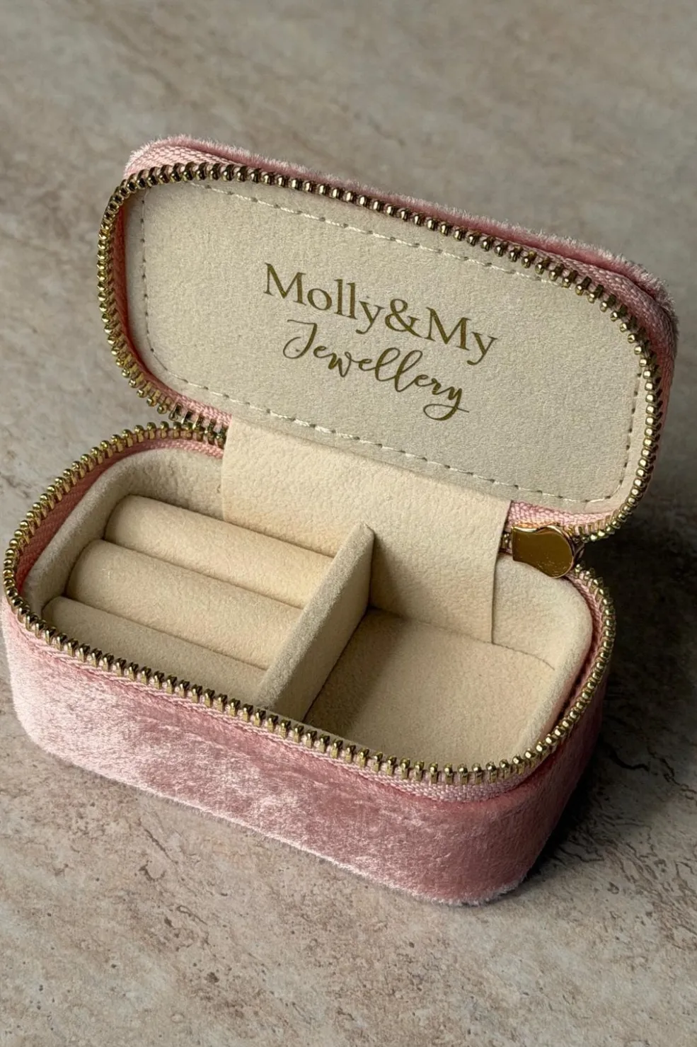 Pink smykkeboks fra Molly&My Jewellery, lavet med komponenter i rustfrit stål. Boksen har en neutral base i hvid, beige og creme med pink detaljer.