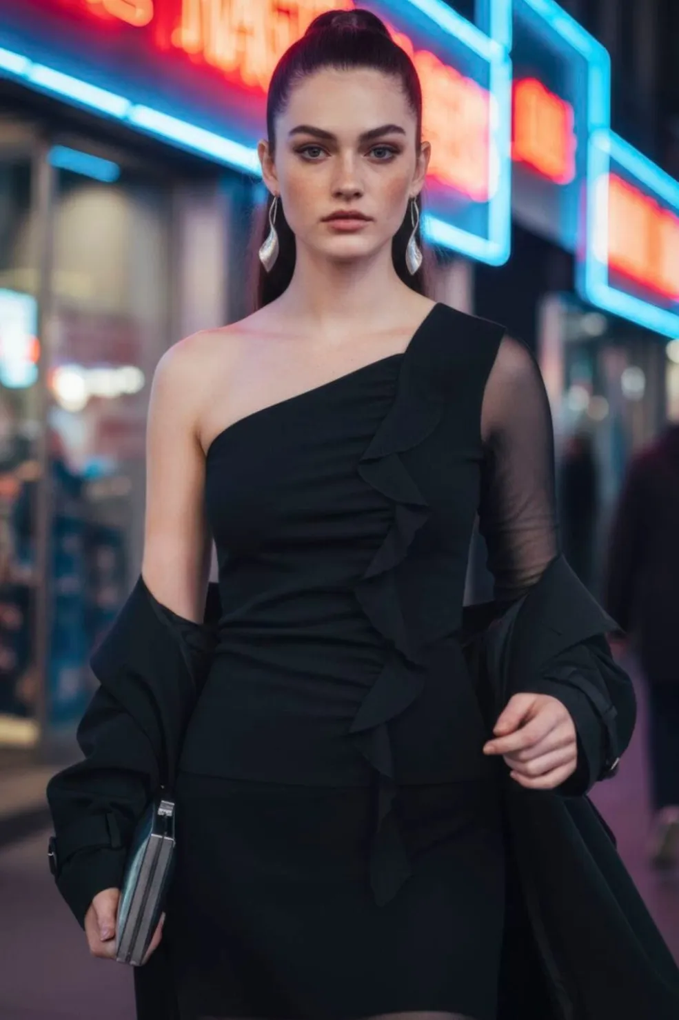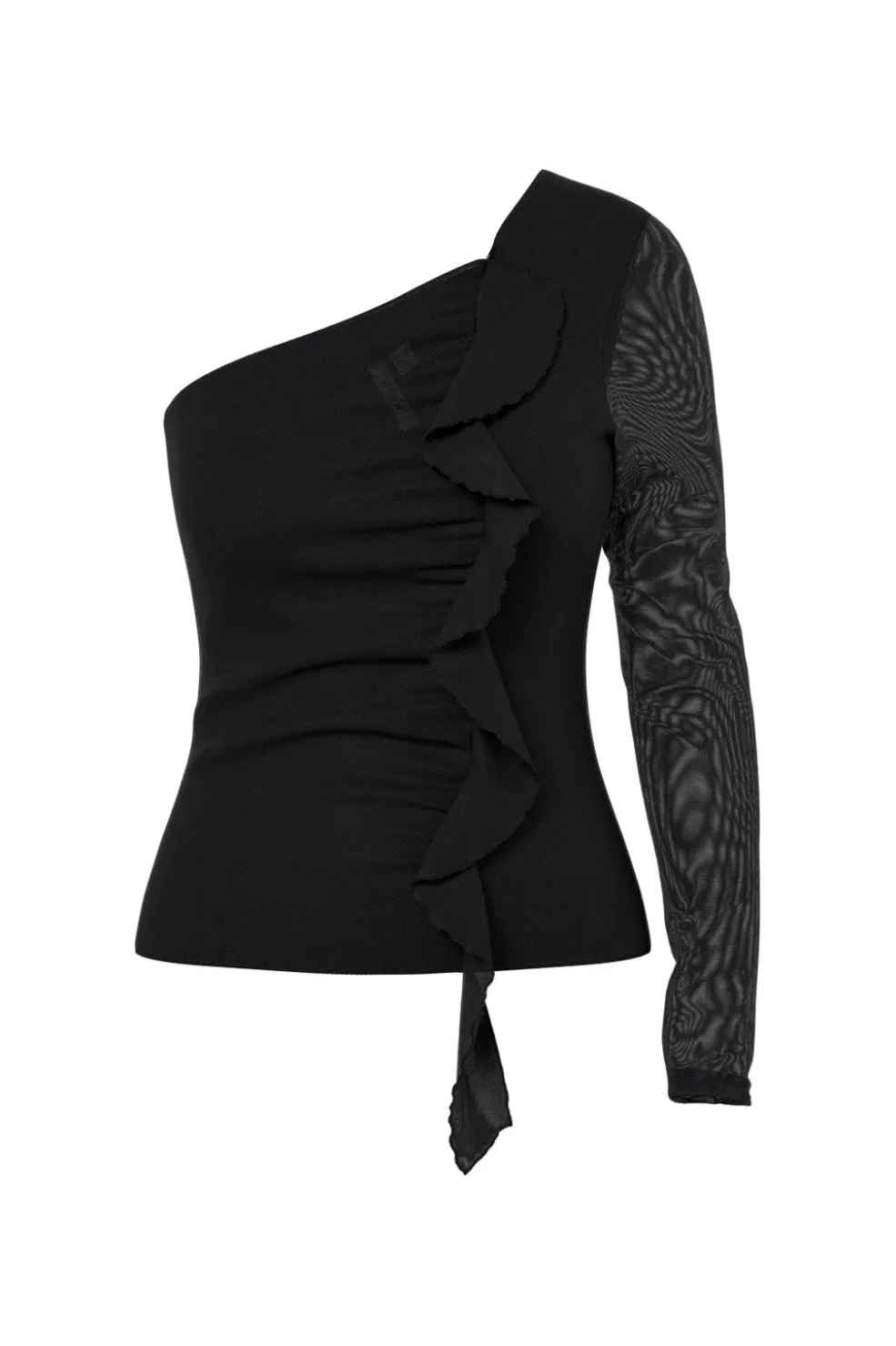 Sort top fra Hypedrop med én-skulderdesign og flæsedetaljer. Toppen har et gennemsigtigt meshærme på den ene side og en tætsiddende pasform.