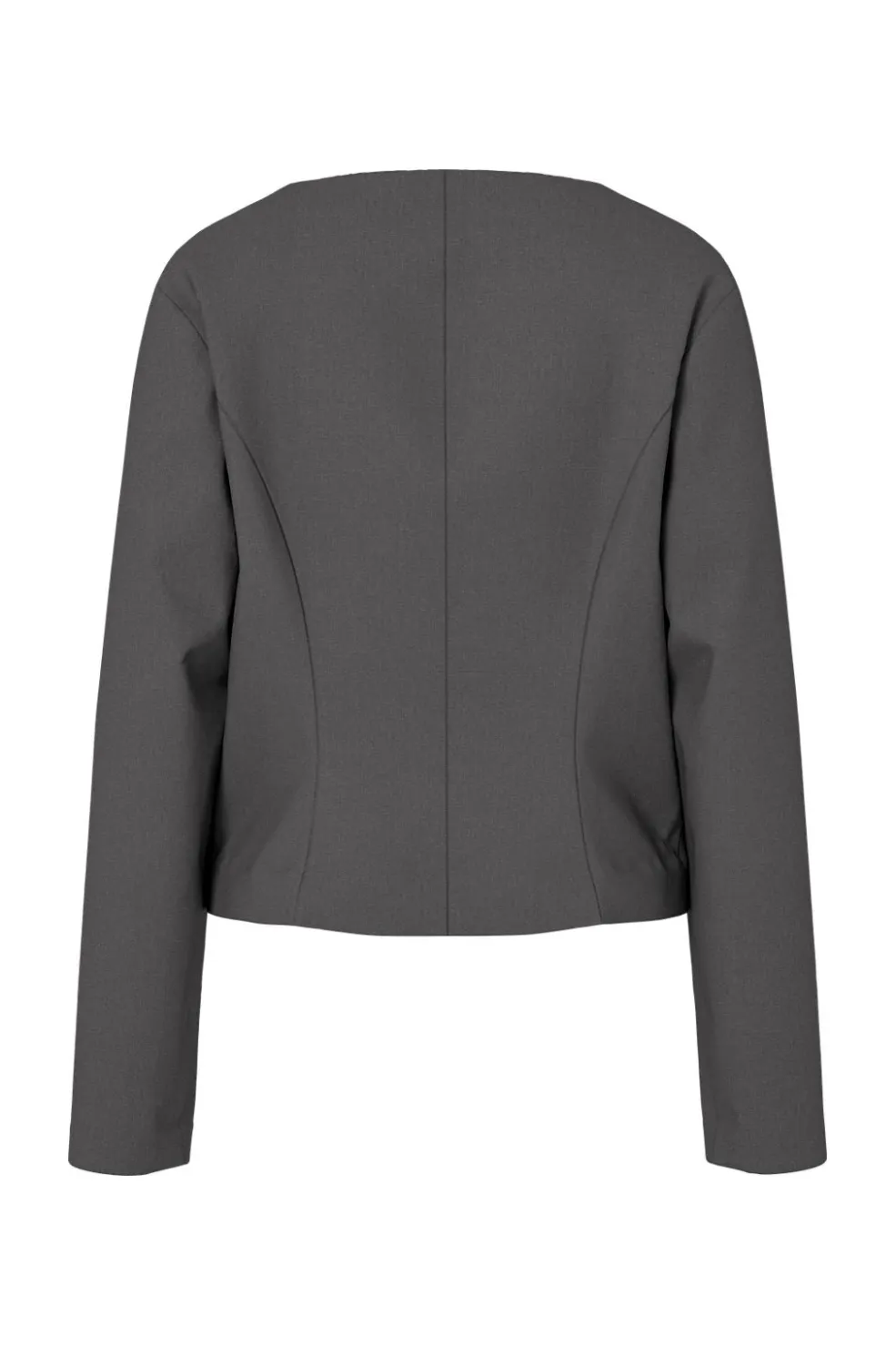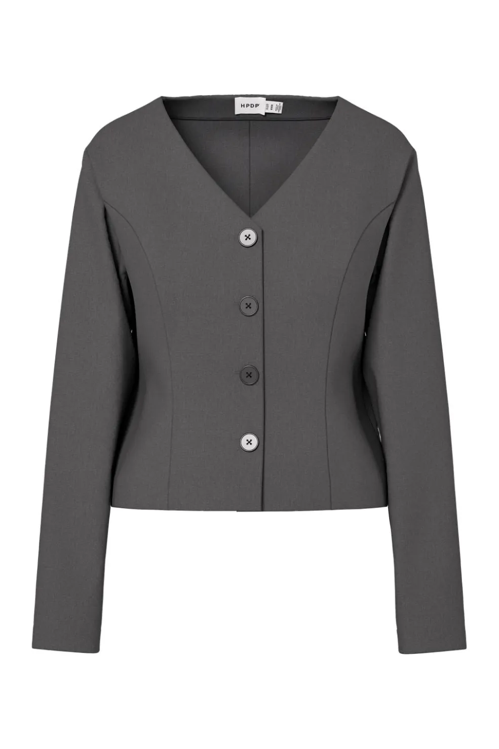 Grå blazer fra Hypedrop med V-hals og knaplukning. Den tætsiddende model har lange ærmer og dekorative syninger, der giver blazeren et gennemført udtryk.
