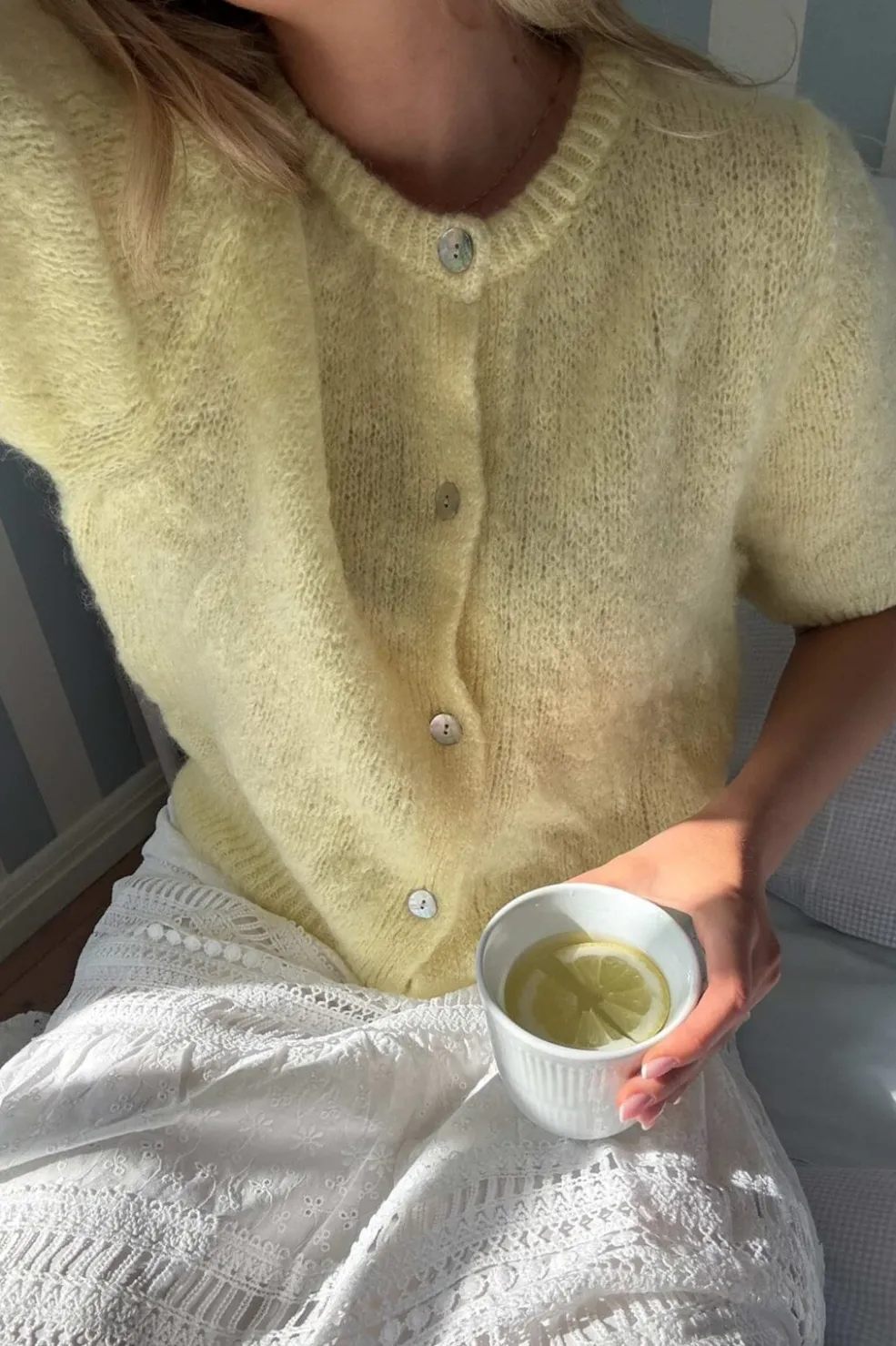 Onesize mohair cardigan med lange, voluminøse korte ærmer, ribdetaljer og knapper med perlemorslook. Normal i størrelsen.