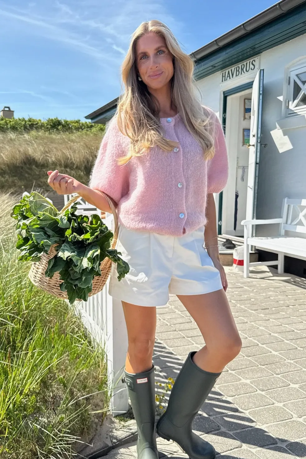 Fuzzy mohair cardigan med lange, voluminøse korte ærmer, ribdetaljer og perlemorslook på knapperne. True to size.