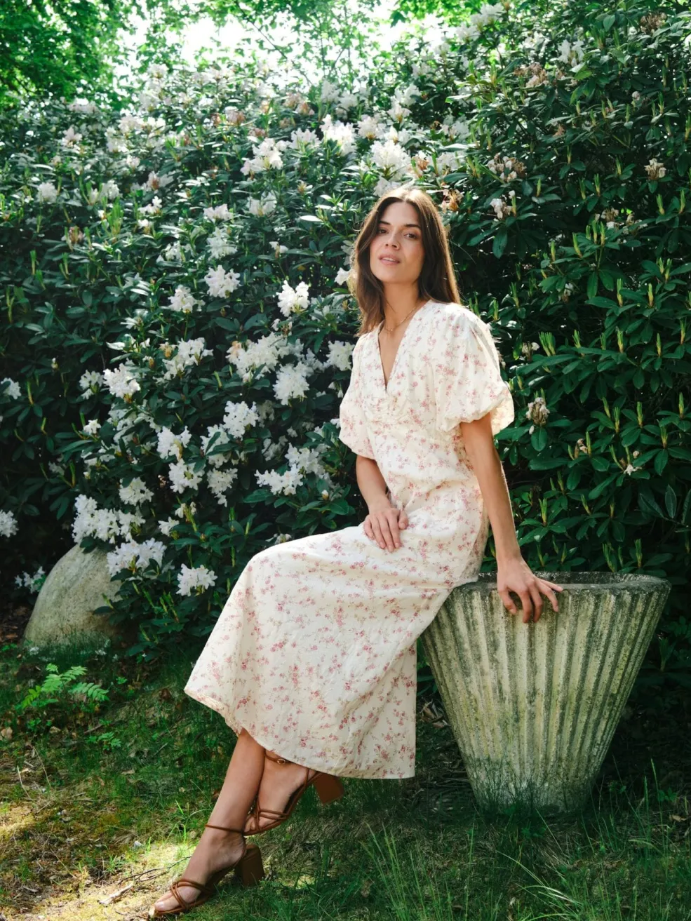 Blomstret kjole fra Neo Noir i dusty rose. Den har V-halsudskæring, korte pufærmer og sidelommer. Kjolen går til midt på læggen og har et let og luftigt snit.