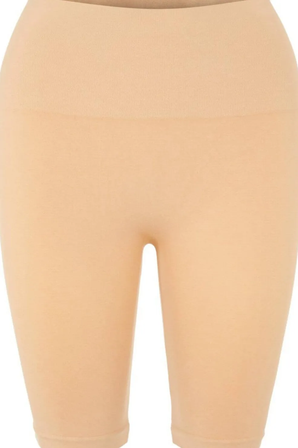 Shapewear-shorts fra Pieces i tan-farve. Shortsene har en høj andel af strækbart materiale, der former sig efter kroppen og giver støtte under tøjet.