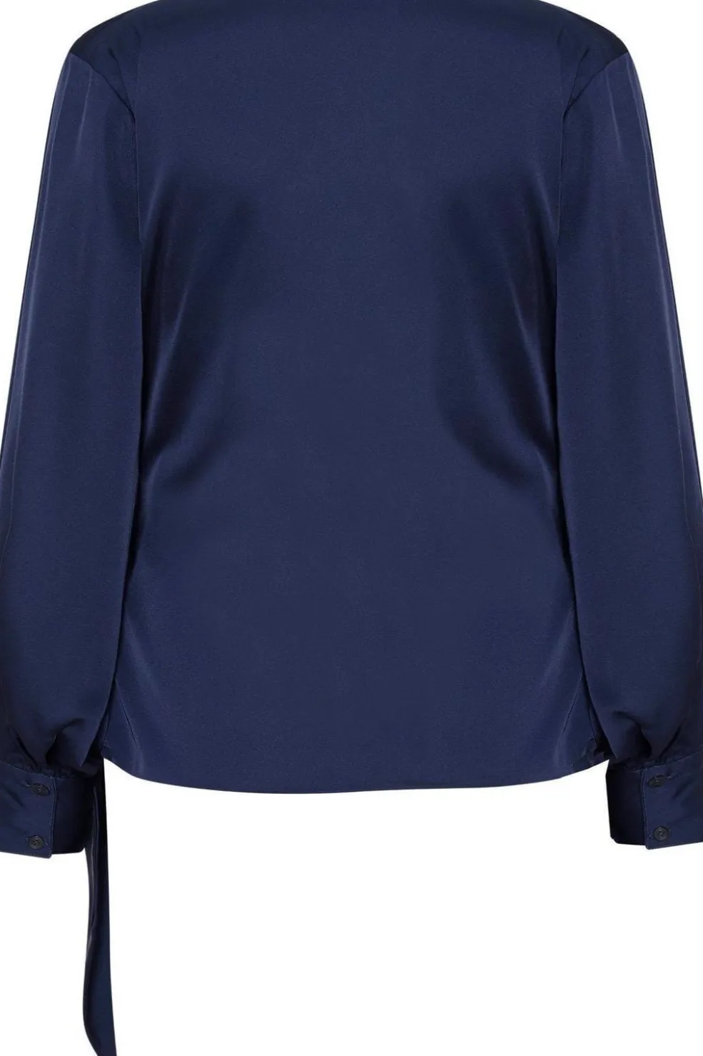Mørkeblå bluse i wrap-design med bindedetalje. Blusen har V-halsudskæring og lange ærmer med knapper ved håndleddet. Satinstoffet giver et blødt fald og en glat overflade.