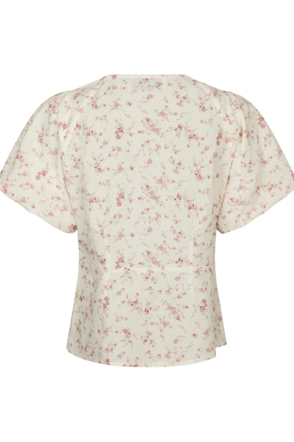 Bluse fra Neo Noir med blomsterprint i støvede rosa nuancer på lys baggrund. Den har puffede ærmer, v-halsudskæring med flæsekant og skjult lynlås.