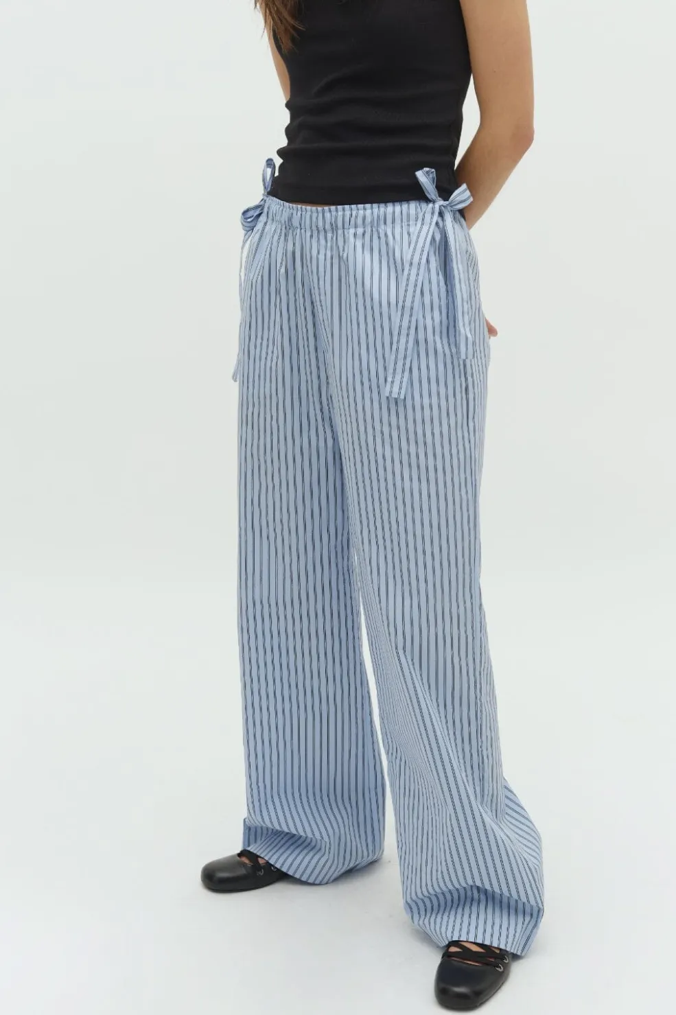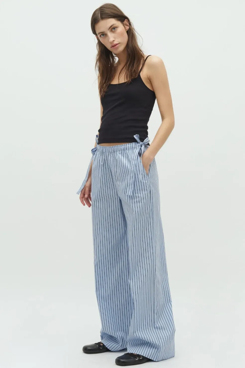 Lyseblå stribede bukser fra MbyM med høj talje og gulvlang længde. De lodrette striber og bindebåndsdetaljer giver bukserne et let og afslappet udtryk.