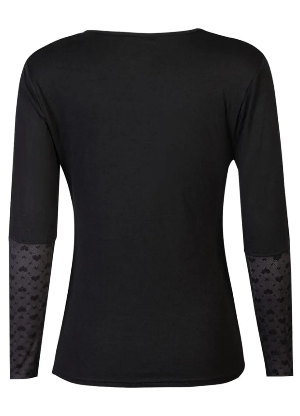 Sort bluse fra Liberte med gennemsigtige blonderærmer med hjerte-mønster. Blusen har en rund halsudskæring og en slim fit-pasform.
