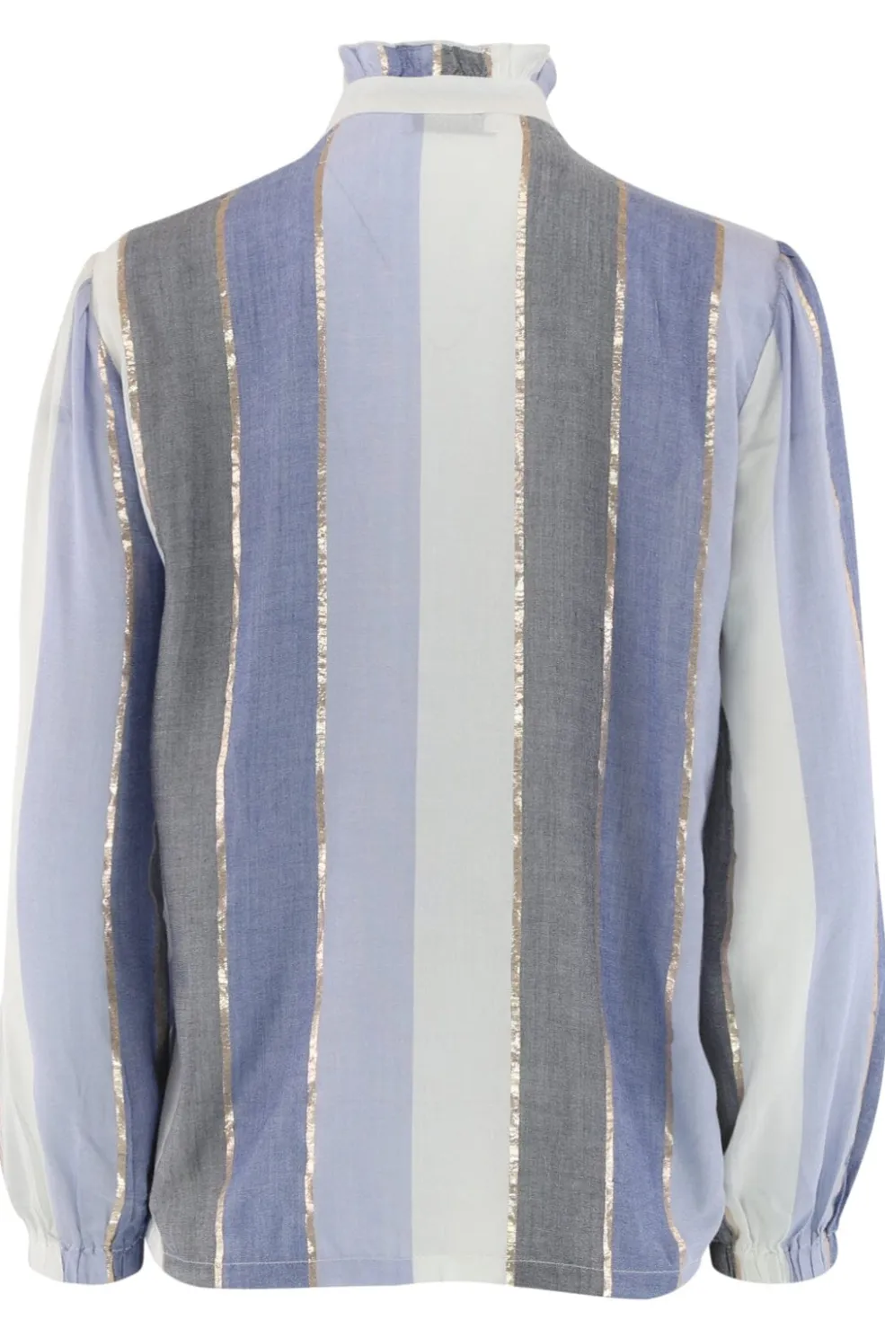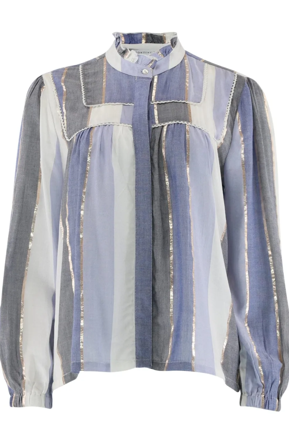 Blå bluse fra Continue med lodrette striber i blå og grå nuancer. Blusen har metalliske accenter, blonder og flæser samt en skjortekrave og lange ærmer med ballonform.