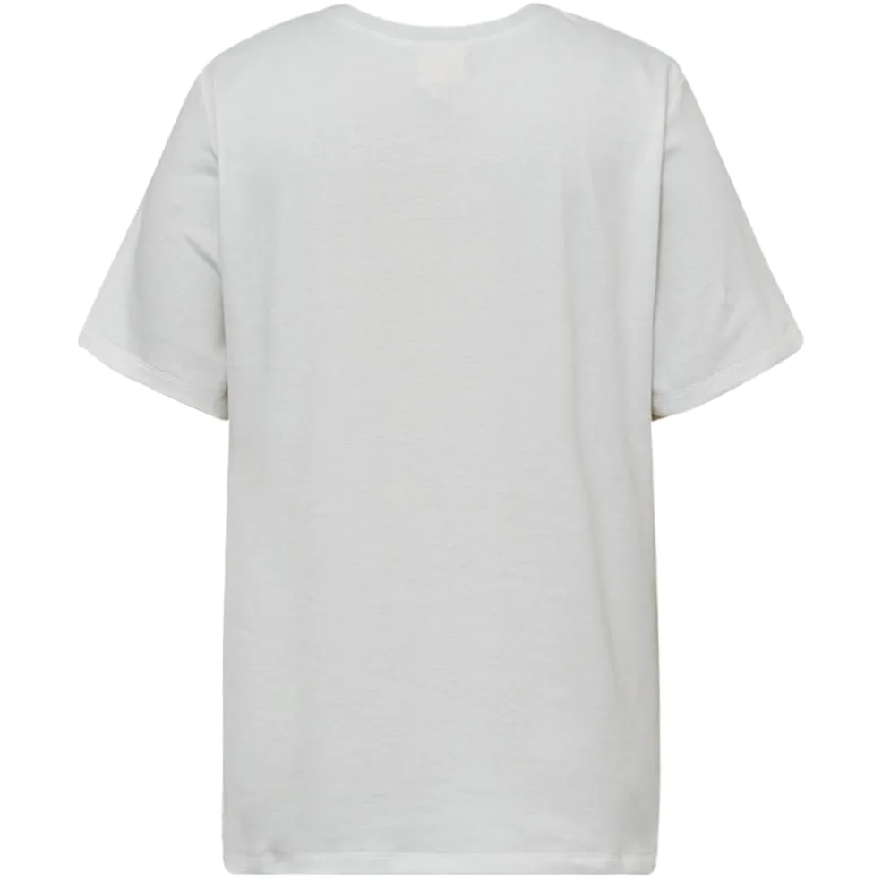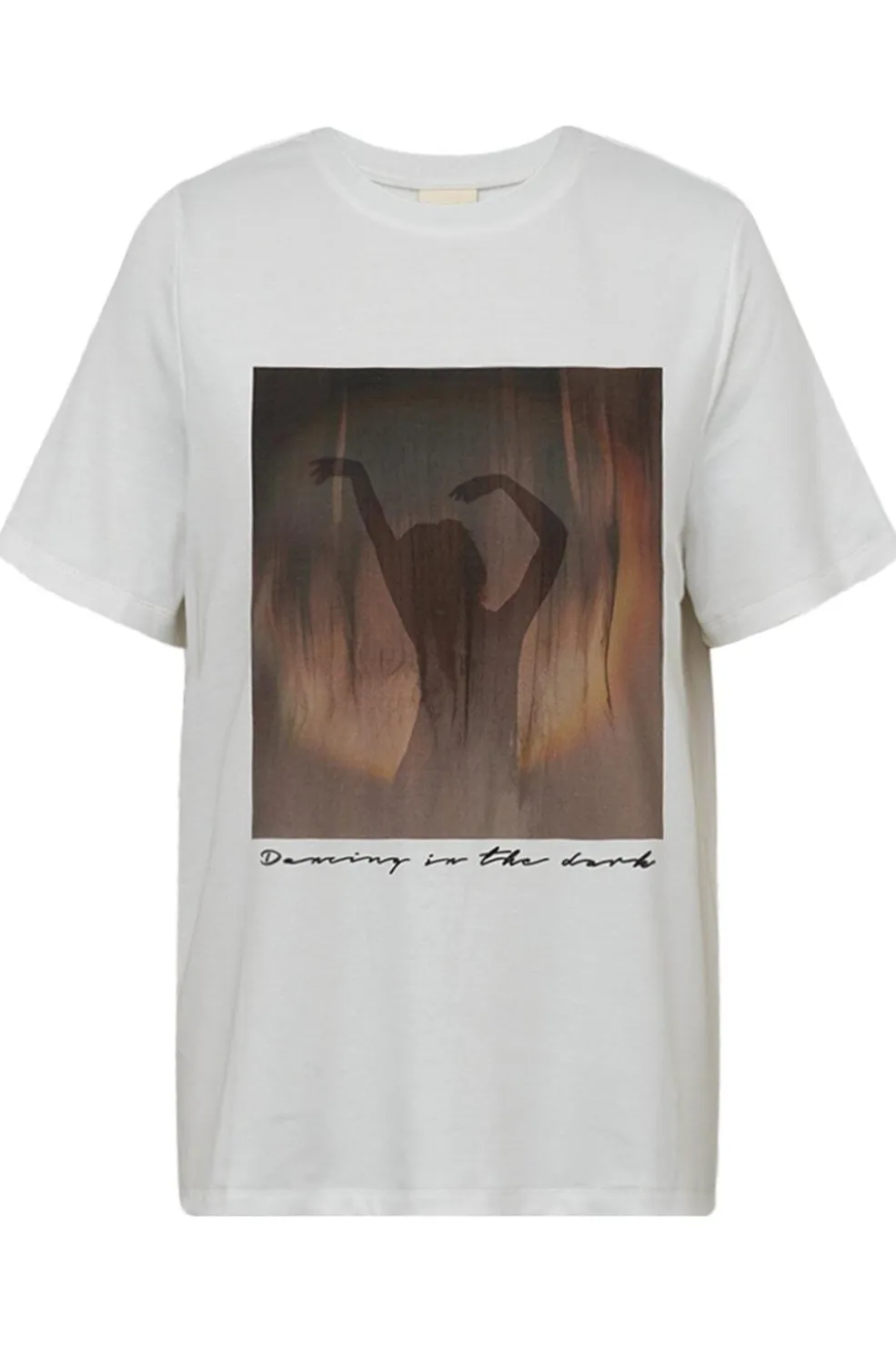 T-shirt fra Gossia i off-white med et grafisk design. Den viser en silhuet med hævede arme og teksten Dancing in the Dark. T-shirten har en rund halsudskæring og korte ærmer.